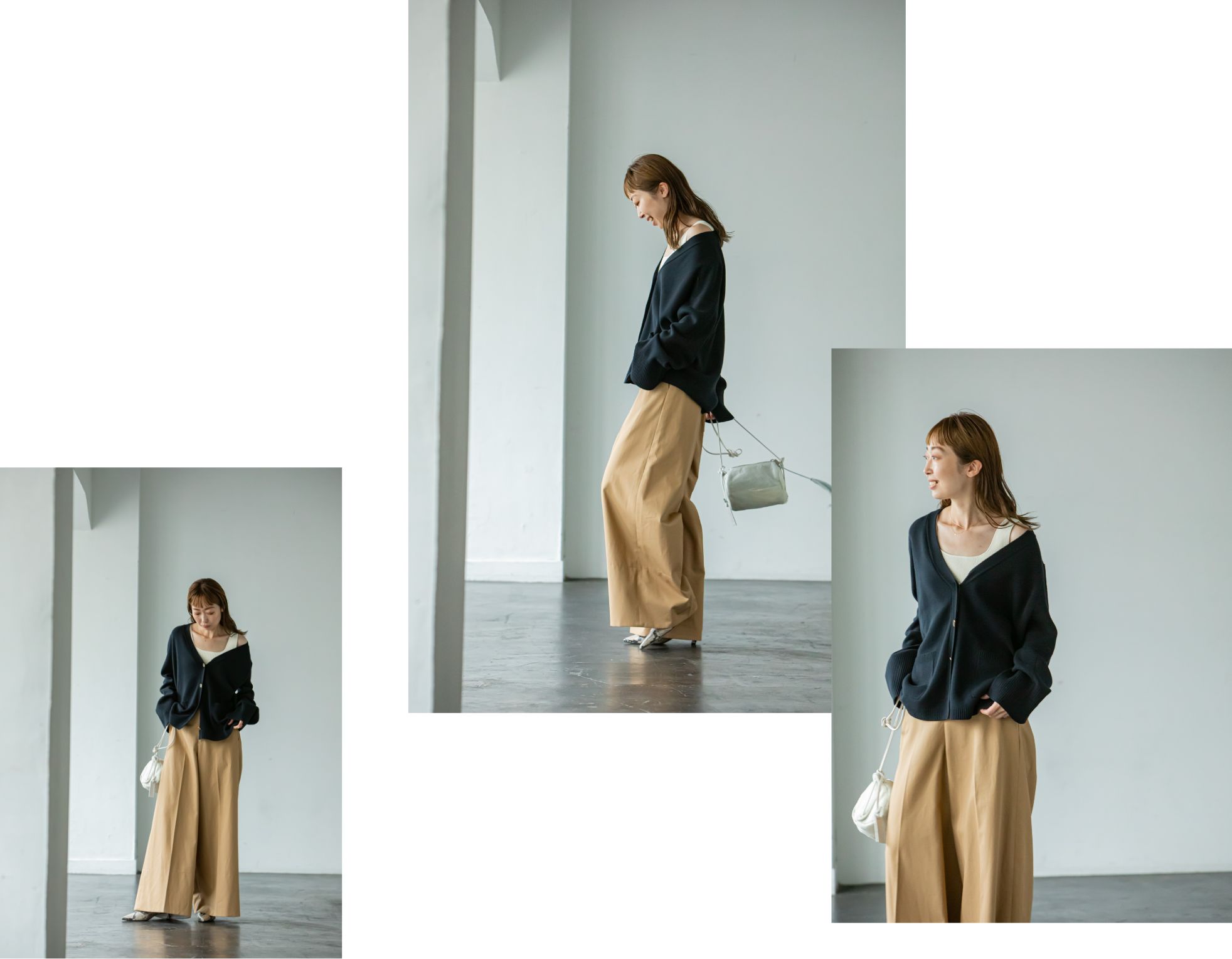 ・身体から離れるように設定した身幅の広いサイズ感で、自然とこなれた印象に