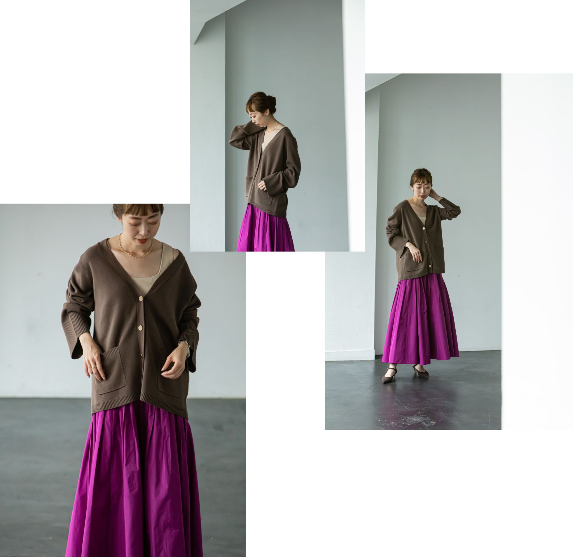 ・フロントに並べた大きめボタンは留める位置で雰囲気が変わるので、カーディガンとしてもプルオーバーとしてもアレンジ可能な2way