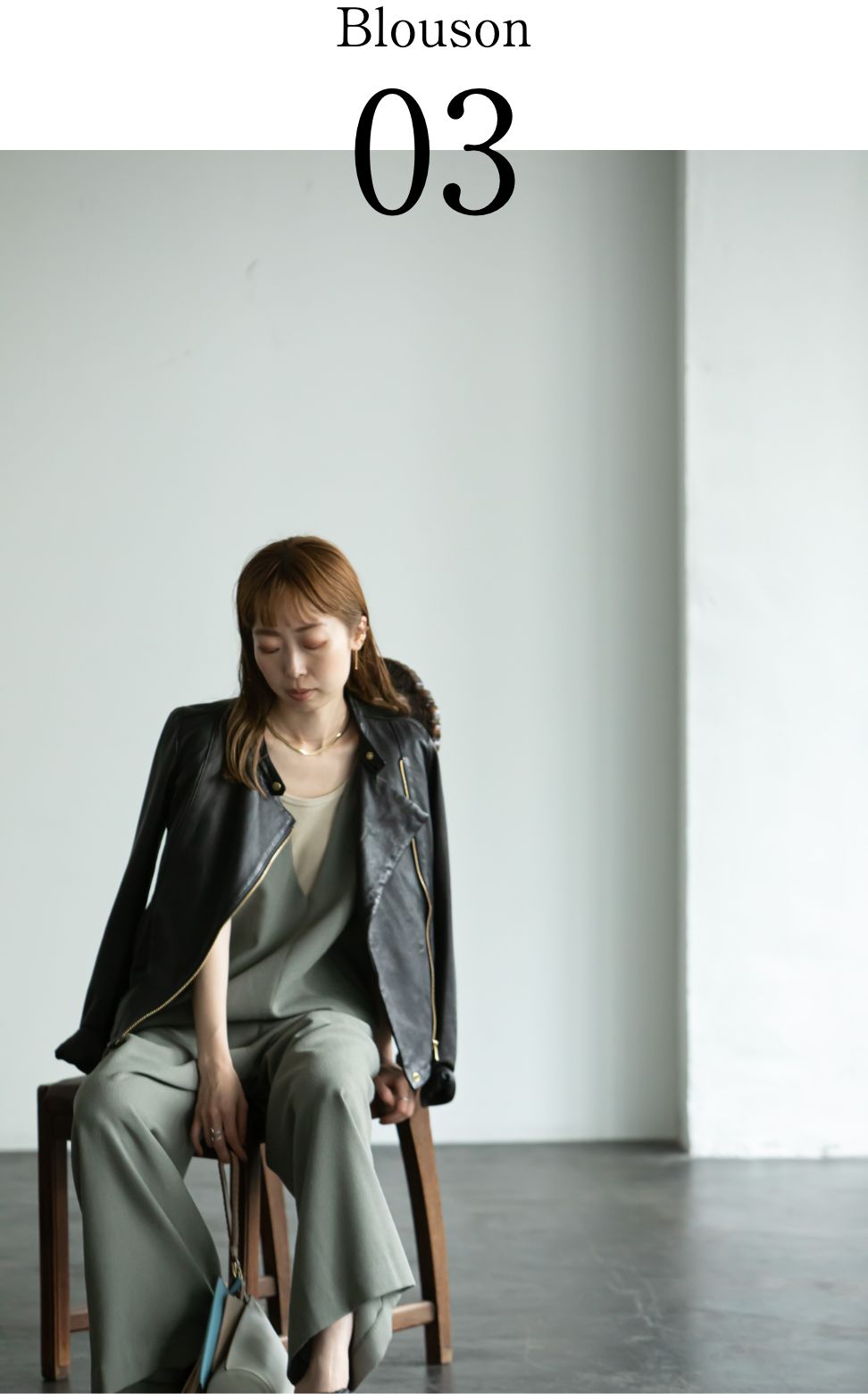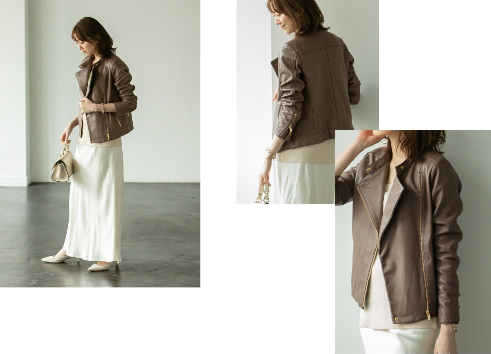 ・スタンドカラーに仕立てることで、レザーブルゾンも女性らしい印象に