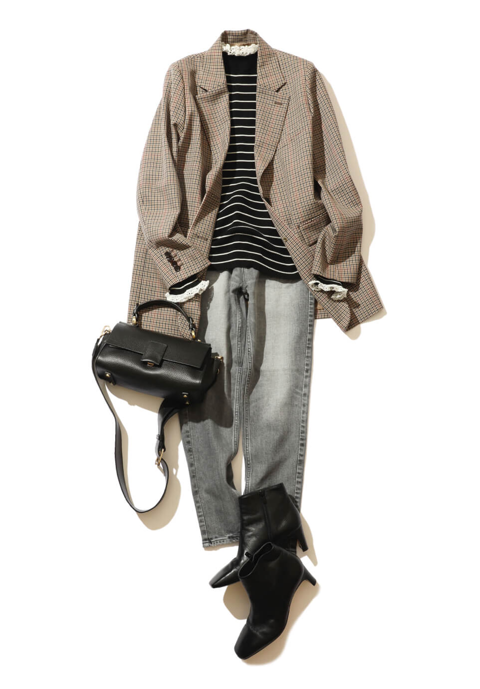 オフのデニムカジュアルをクラスアップしてくれるのがジャケット。ちょっぴり渋めでハンサムなブラウンが使い勝手良く◎インナーに合わせたボーダーのハイネックトップスは、首元と袖口にレースがドッキングされたレイヤード風のデザイン。ハンドルバッグ&ショートブーツは大人な黒で統一して。