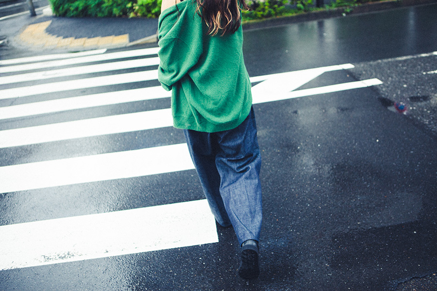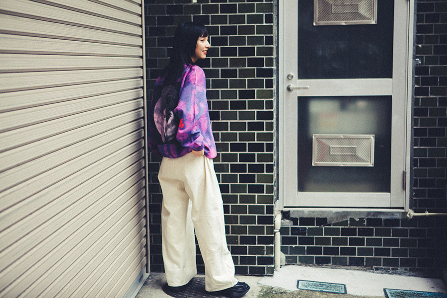 最初写真で見せていただいたときにインパクトのあるアイテムだと思って、それに負けないようなコーディネートにしたいなと考えていたのですが、穿いてみると意外にシルエットはすっきりしていて。今日はレザーのローファーを選びましたが、スニーカーにも合わせやすそうですね。トップスも大きめのものから、ジャストサイズのものまで幅広く合いそう。