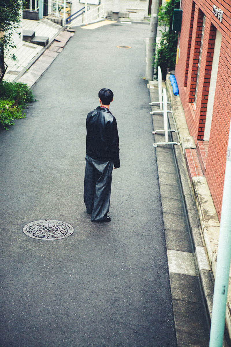 ジャケットはアメリカ古着にあるようなシンプルなものを選び、パンツから感じる品の良さからスカーフを首に巻いたりして、全体のバランスを考慮しました。上下黒を合わせるとどこが境目か分かりづらくなると思うんですが、こういうシャンブレーっぽい黒だと上下でコントラストが出せる点もすごく良い。あと腰回りにディテールが多いと、タックインした時に存在感が出るのもポイントが高いですよね。自分はタックインしがちなので、そういった点も含めてすごくいいパンツだなと思いました。