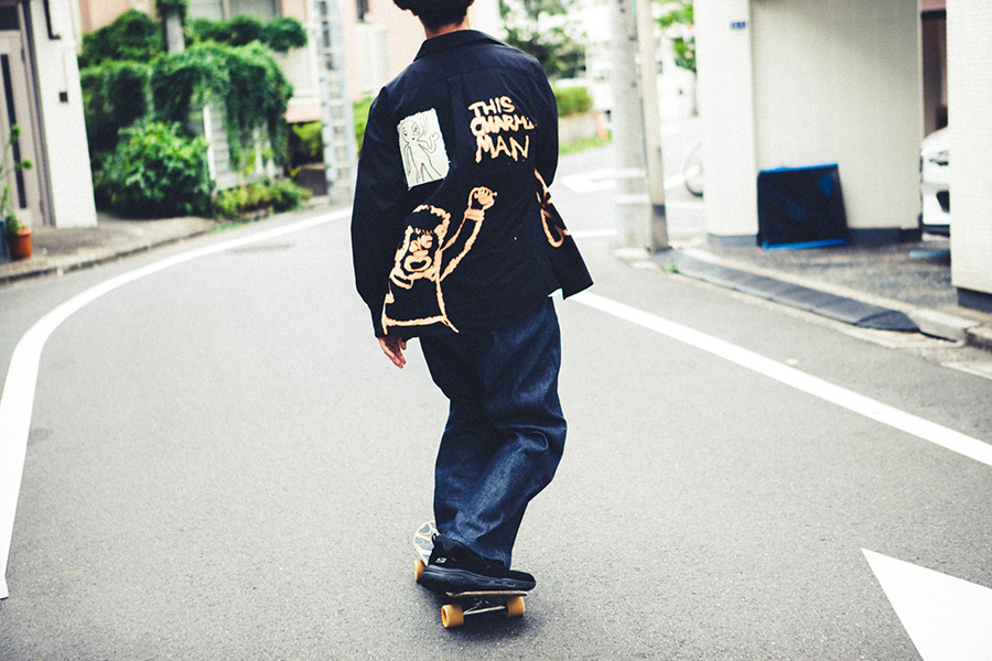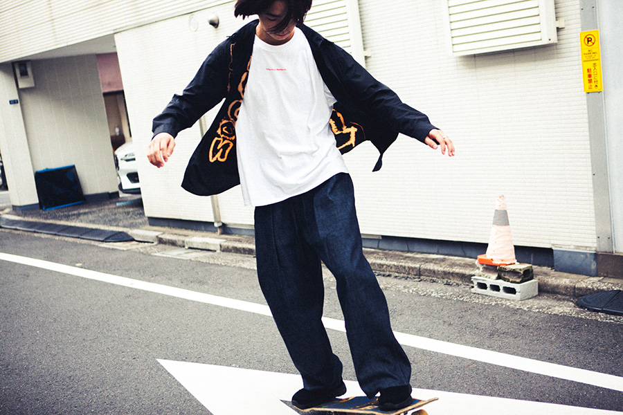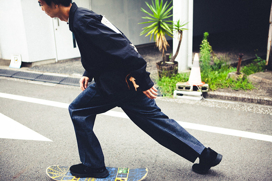 これは太いけど野暮ったい感じはしなくて、すごく好きなシルエットでした。太いけど、ウエストがすっきり見えるいい塩梅のパンツをちょうど探していたんですよね。あと、こういう色のデニムって、生地に洗濯糊がついていて硬めだけど、これは買ってすぐ穿いてスケートもできる。他にも細かいところで言えばポケットの形もワークパンツのディテールを踏襲しているし、フロント部分もスナップボタンっていうのも楽でいいですよね。