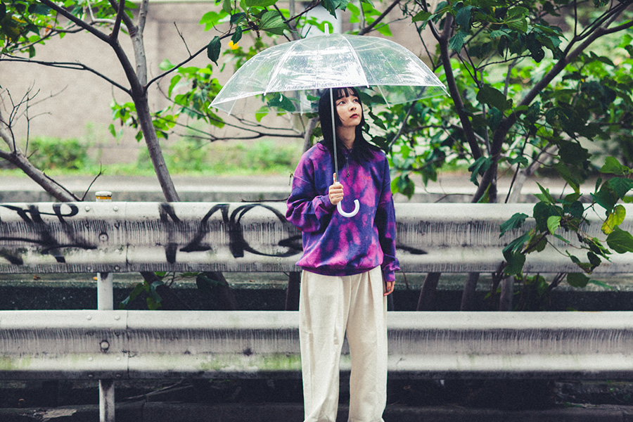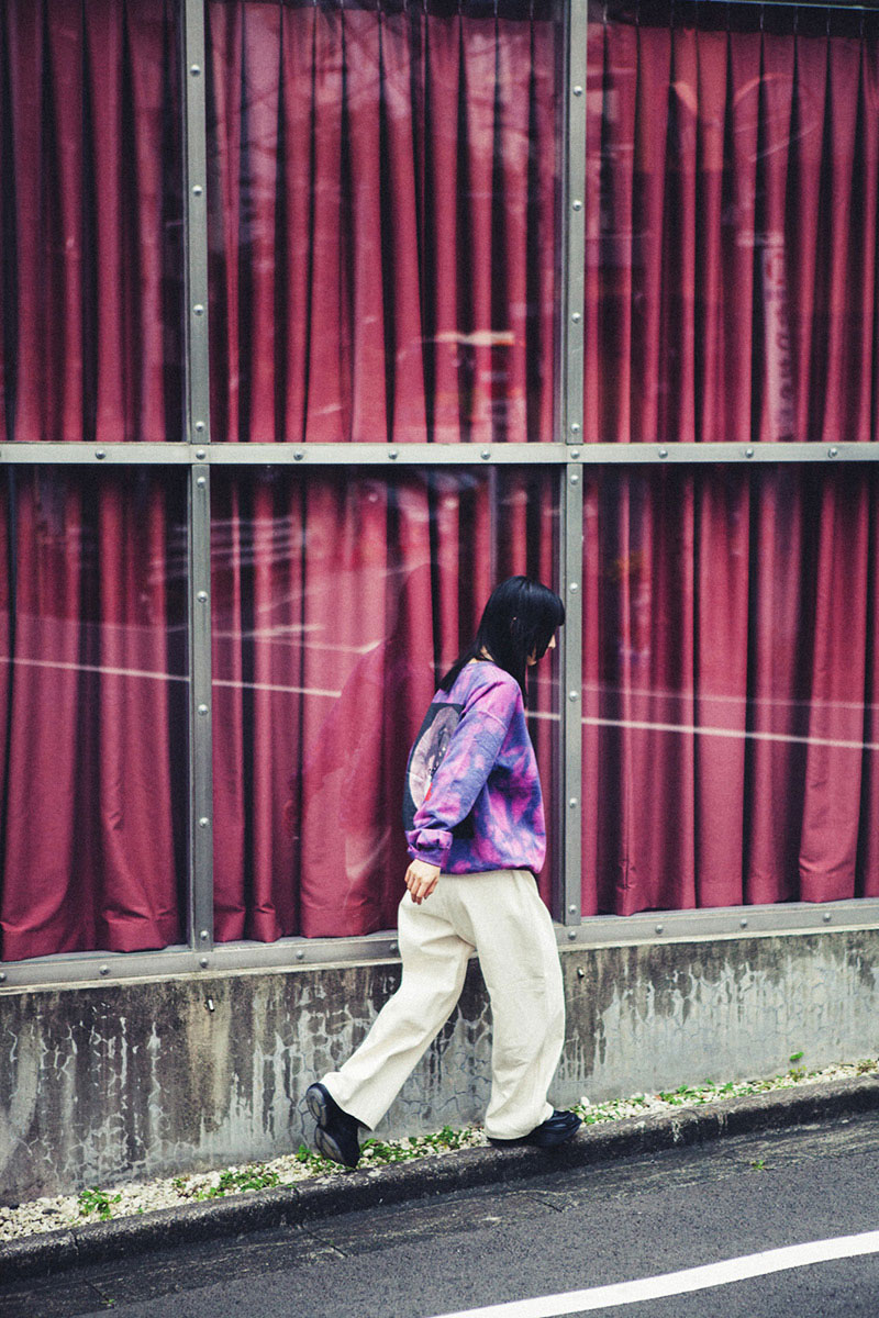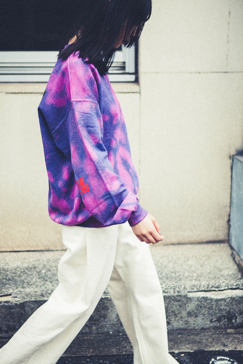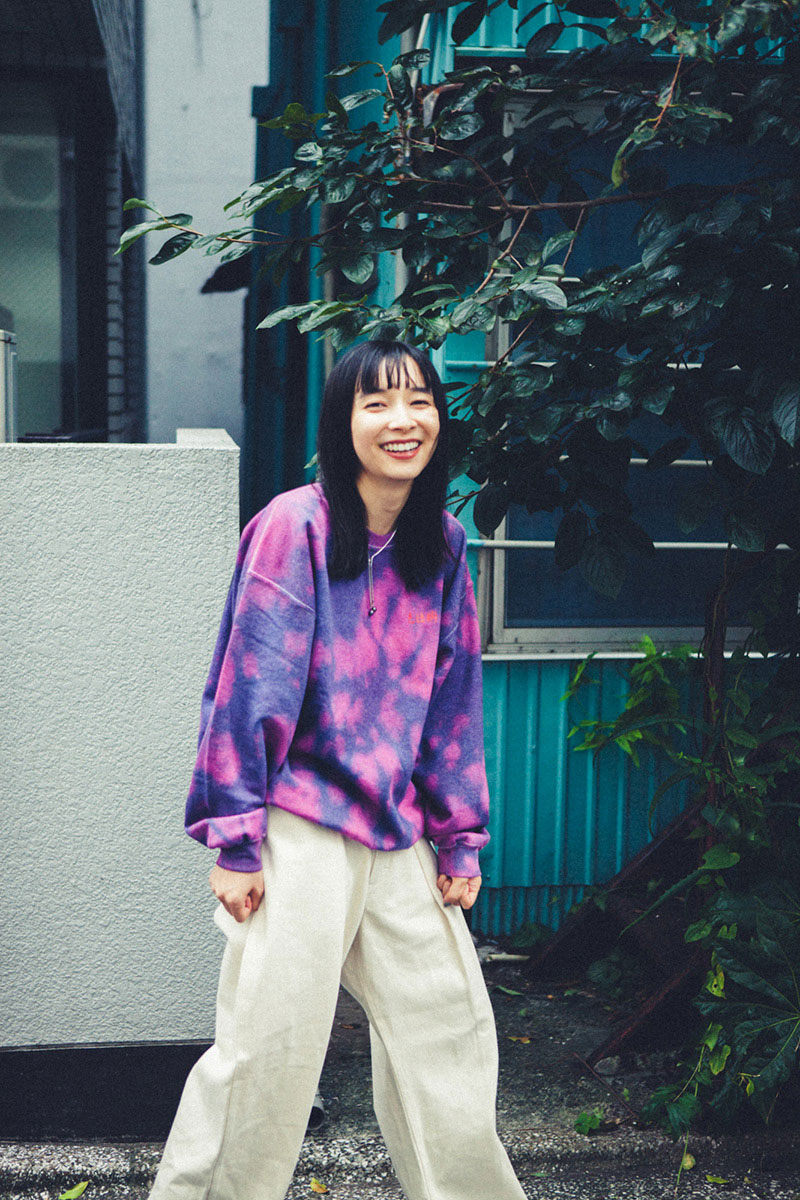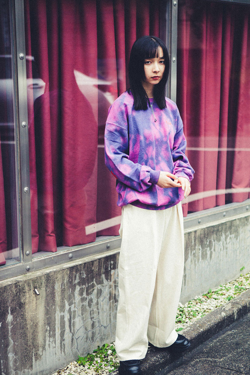 まず一番最初にゆるっとしたスタイルで穿きたいなと考えつつ、その中でも個性を出したいとなと思って。色と柄にインパクトのあるタイダイ柄のスウェットをトップスに選びました。もっとダボダボしてしまうのかなと思ってたんですけど、実際に穿いてみたらシルエットもきれいだったので、合わせ方によってはビシッとも着れそうですし、スタイリングの幅は広そうですね。