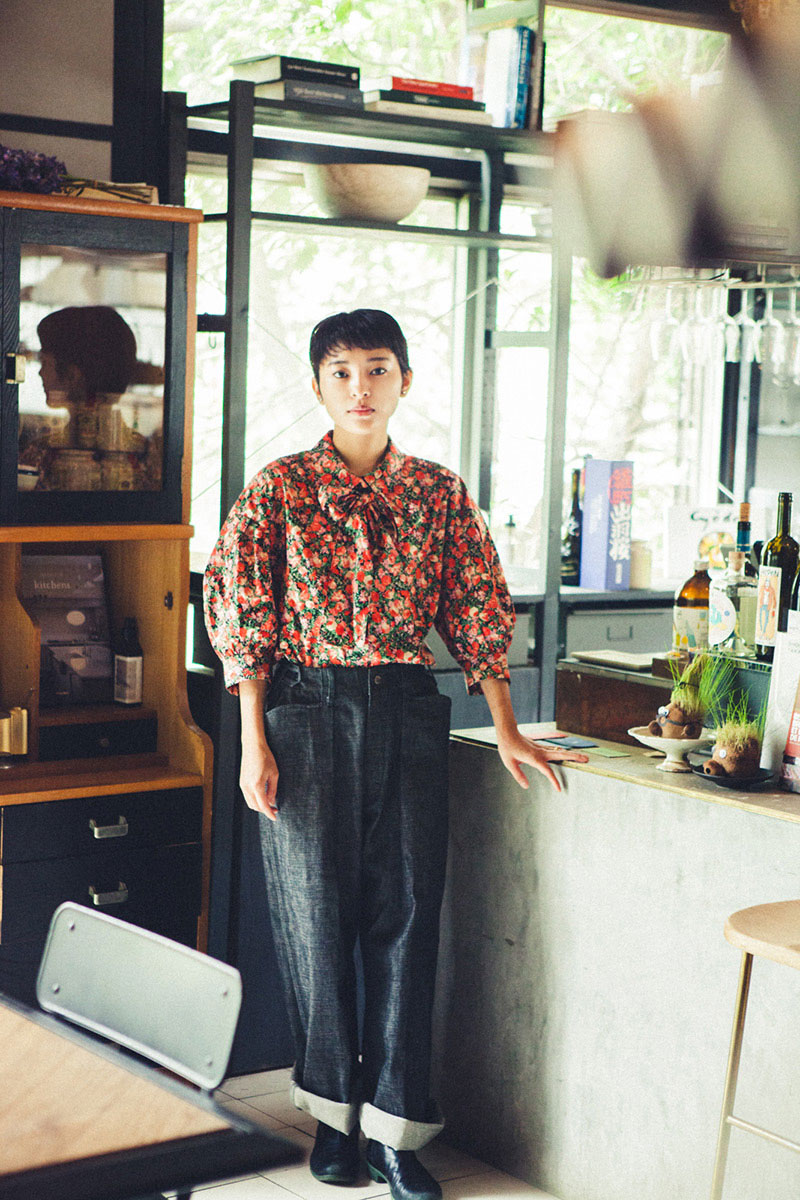 自分はボーイッシュな格好があまり似合わなくて、デニムなどのカジュアルなアイテムを着る時は、なるべくガーリーテイストなものをと思って、今日はこの花柄シャツを選びました。普段からタックインするスタイルが多いので、ボタンでウエストを調節できるのは嬉しいですし、インした時に腰回りのデザインが映えますね。