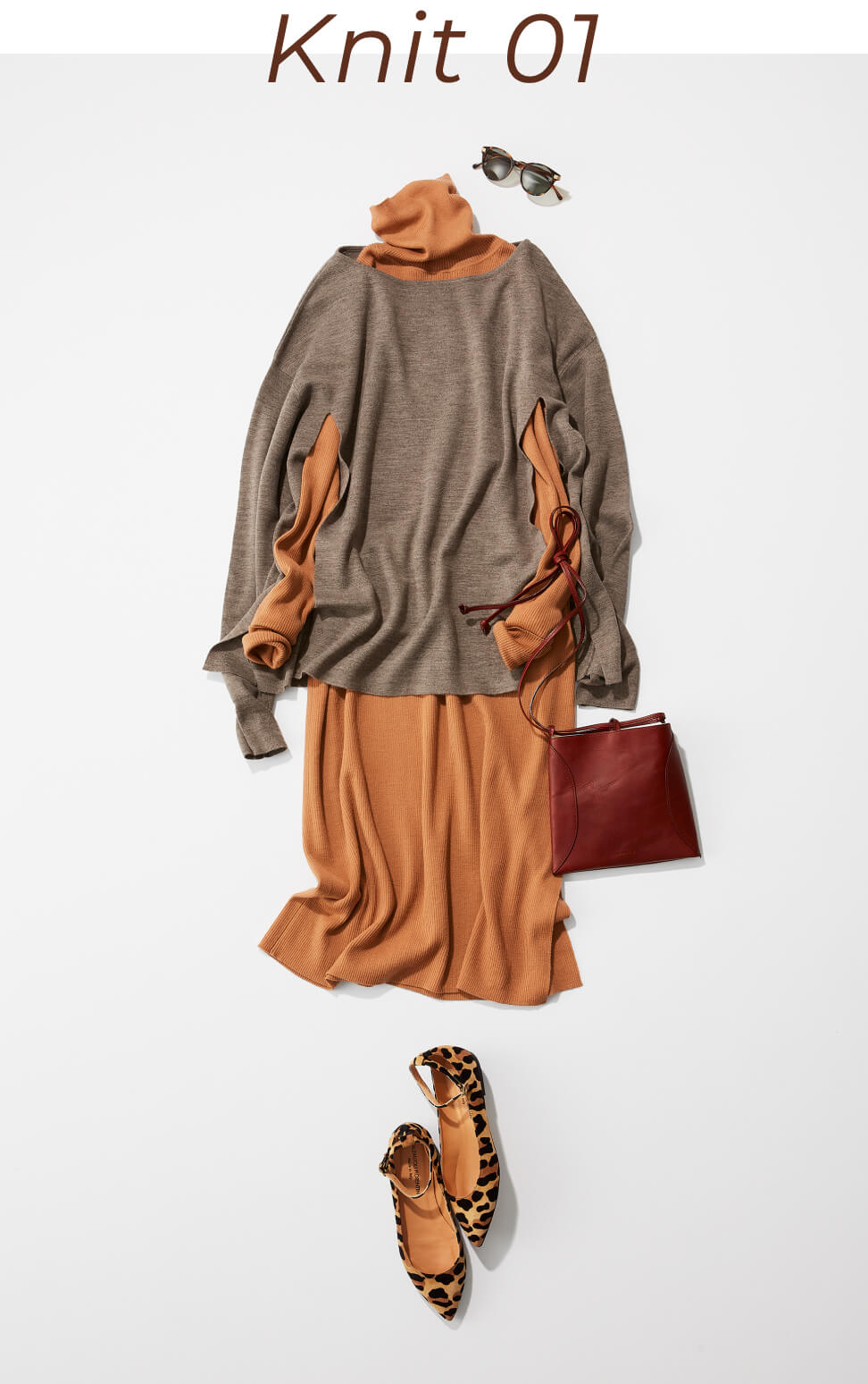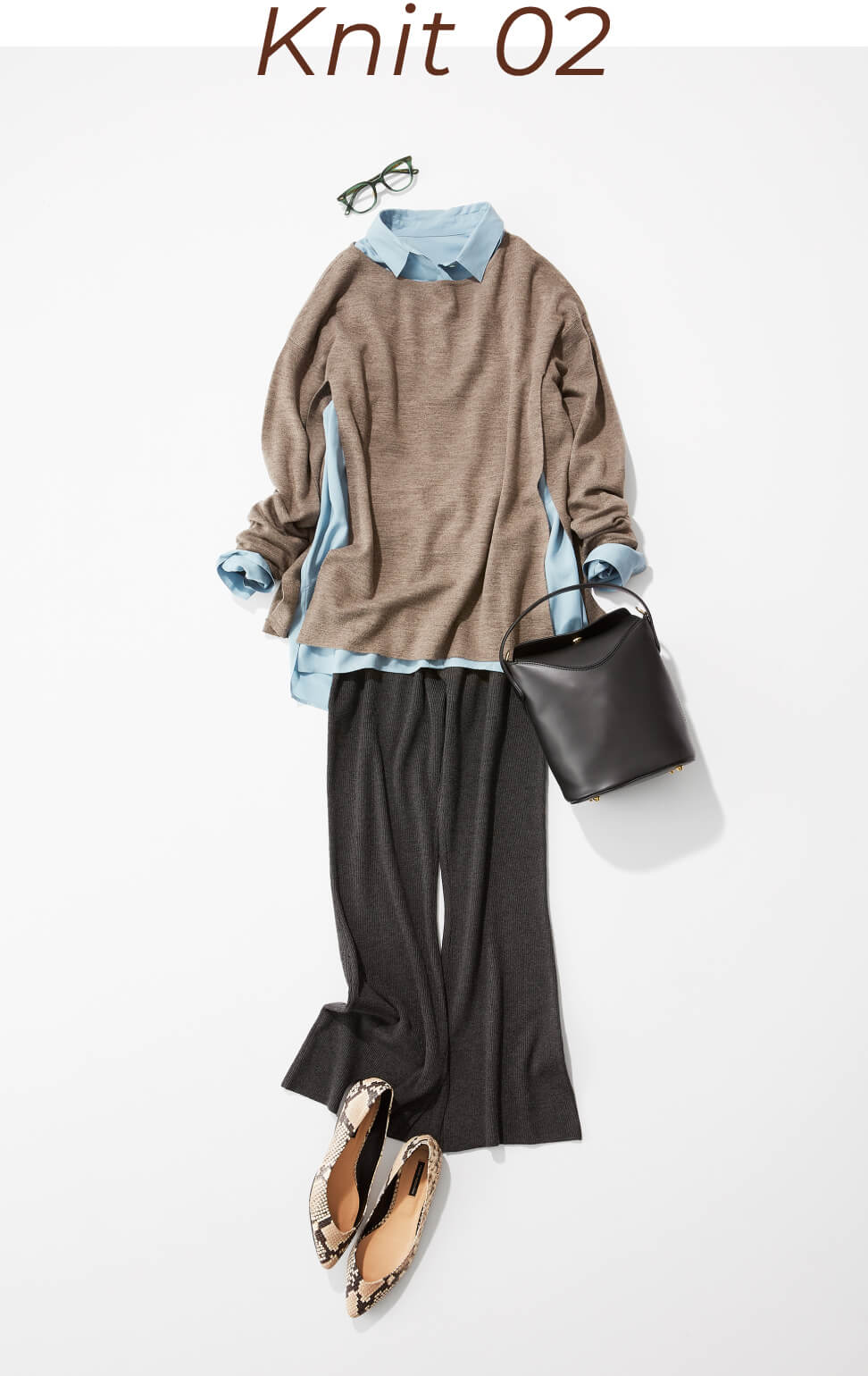 「ライトブラウンのニットは両サイドにスリット入り。シャツの上にニットを羽織った定番スタイルも、スリットからブルーのシャツをチラ見せすることで鮮度が一気にアップします。シャツは裾が長めなので気になるお腹周りもカバーでき、とろみ素材がクールな中に女っぽさを漂わせてくれます。ボトムスにはこなれ感のあるニットパンツを合わせて、旬なニットonニットを実践。ニットレイヤードのときは、パイソン柄のポインテッドトゥシューズなど、エッジの効いた辛口な足元が正解です。」