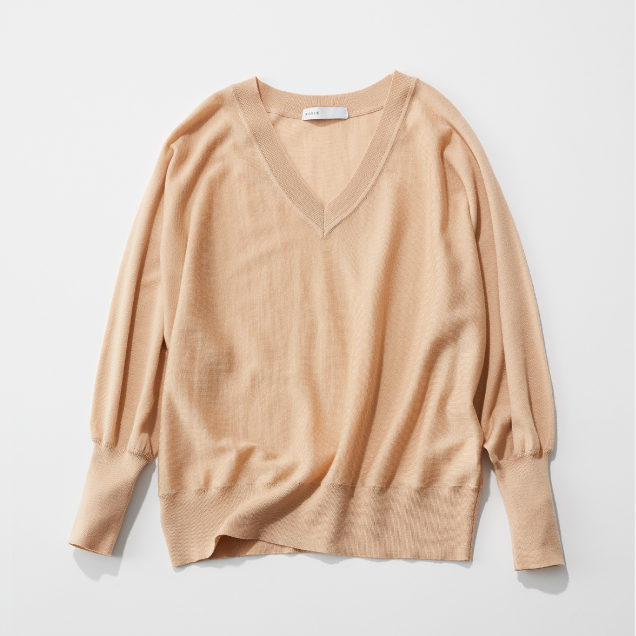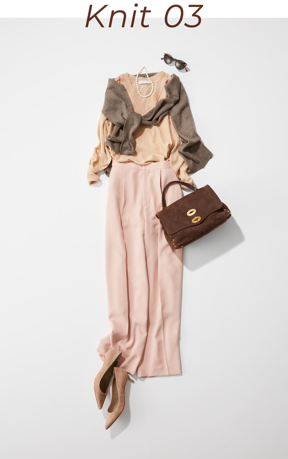 「ベージュ×ピンクのまろやかな配色は上品ですが、ともするとぼんやりした印象になりがち。そこでライトブラウンのニットを肩掛けすることで、スタイリングをシャープに引き締めて。ライトブラウンは優しい色合いなので、淡い色に合わせてもコントラストが強すぎず、フェミニンな雰囲気をキープ。目線が上がるので、スタイルアップ効果も叶います。ここでもトップスはニットonニット合わせで、今っぽさを演出しました。」