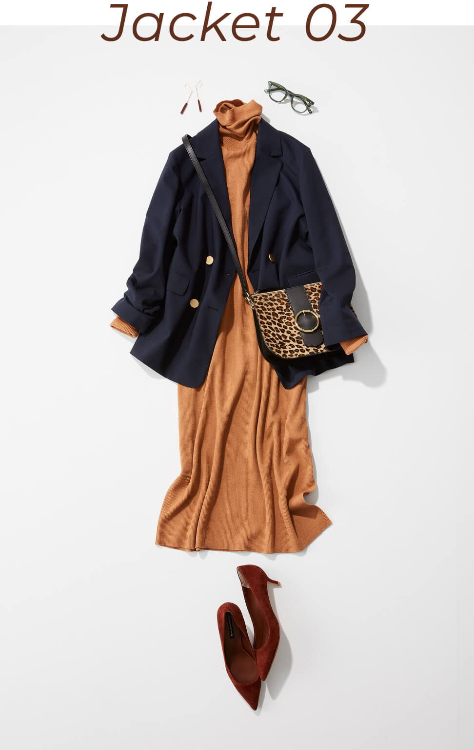 「ニットワンピースが着たいけど、体型が気になる…そんなときこそハンサムなジャケットを羽織って、辛口なキレをプラスするのが正解。ニットのオレンジがかったキャメル色は、ジャケットのネイビーカラーと相性抜群。ニットワンピースのキャメルにつながるパンプスをセレクトすれば、すっきりした印象に仕上がります。旬なレオパード柄のバッグは、ショルダーストラップを短めに斜めがけすれば、見た目の重心が上がってバランス感もアップします。」