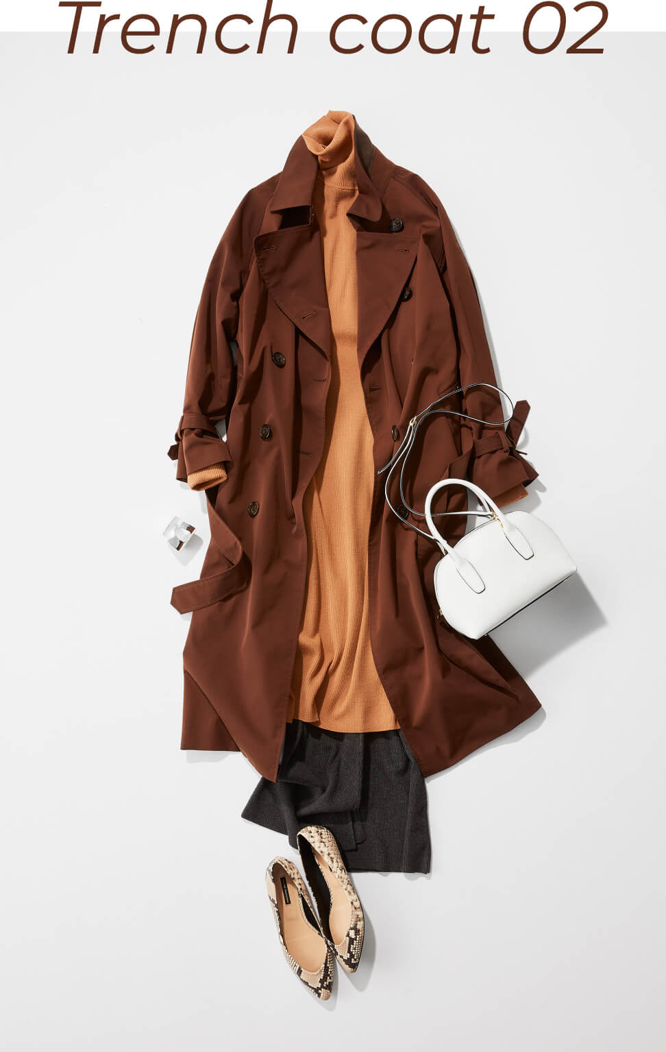 定番のトレンチコートを、大きめボタンやゆったりめのサイズ感で女らしくアップデート。シワになりにくい素材を用い、柔らかな肌触りとしなやかな着心地はデイリーユースにぴったりです。深みのあるチョコレートブラウンが、秋冬のスタイリングにお似合い。