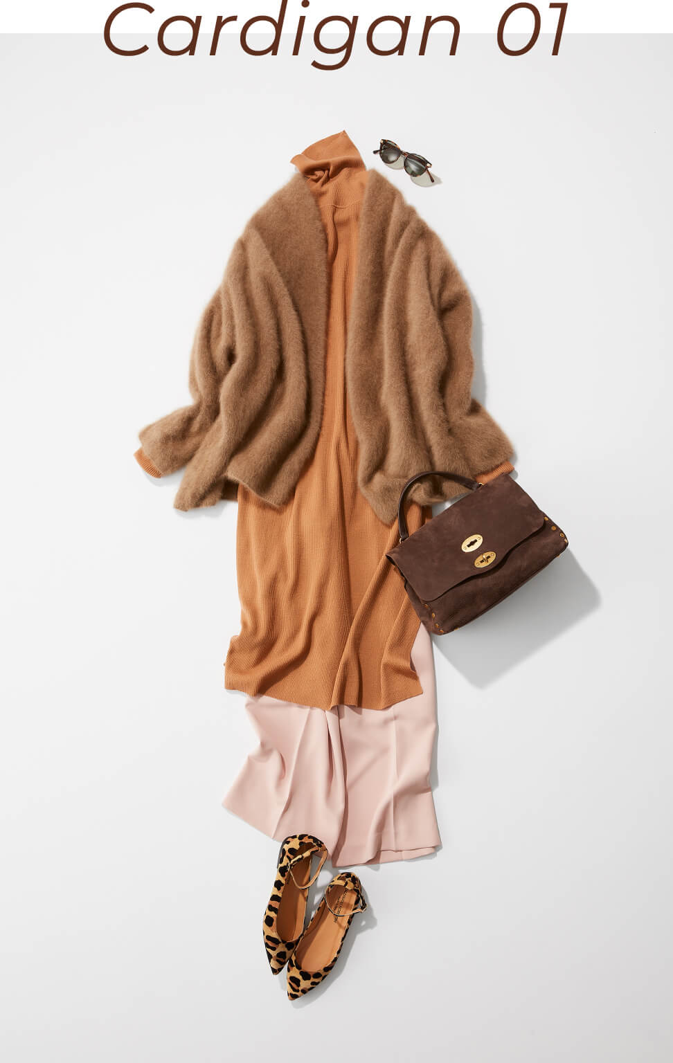 「アンゴラのふんわりガウンをハイゲージのニットワンピースに重ねたニットonニットの着こなし。質感の異なるアイテムをレイヤードすると、スタイリングに奥行きが出るのでのっぺりせず、おしゃれ度がアップします。ニットワンピースはアレンジ力抜群のサイドスリット入り。パンツを合わせたロング&ロングの組み合わせも、バランスよく決まります。複数アイテムをレイヤードするときは、色味のトーンを揃えてシックにまとめる鉄則。足元はレオパード柄で辛口のアクセントを効かせて。」