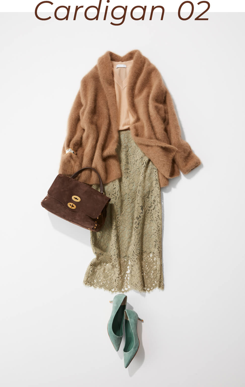 「アンゴラガウンをアウター風に襟を抜いて、女っぽくリッチに着こなします。今秋らしいくすみパステルのレーススカートは、ブラウンと合わせると一気に秋めいた印象に。足元も落ち着いたターコイズブルーのスエードパンプスでスカートとトーンを合わせると、洗練されたおしゃれな雰囲気が演出できます。ほっこりしがちなモヘアの腕元には、シルバーのバングルでクールな光を足して、キレの良いスタイリングに仕上げます。」