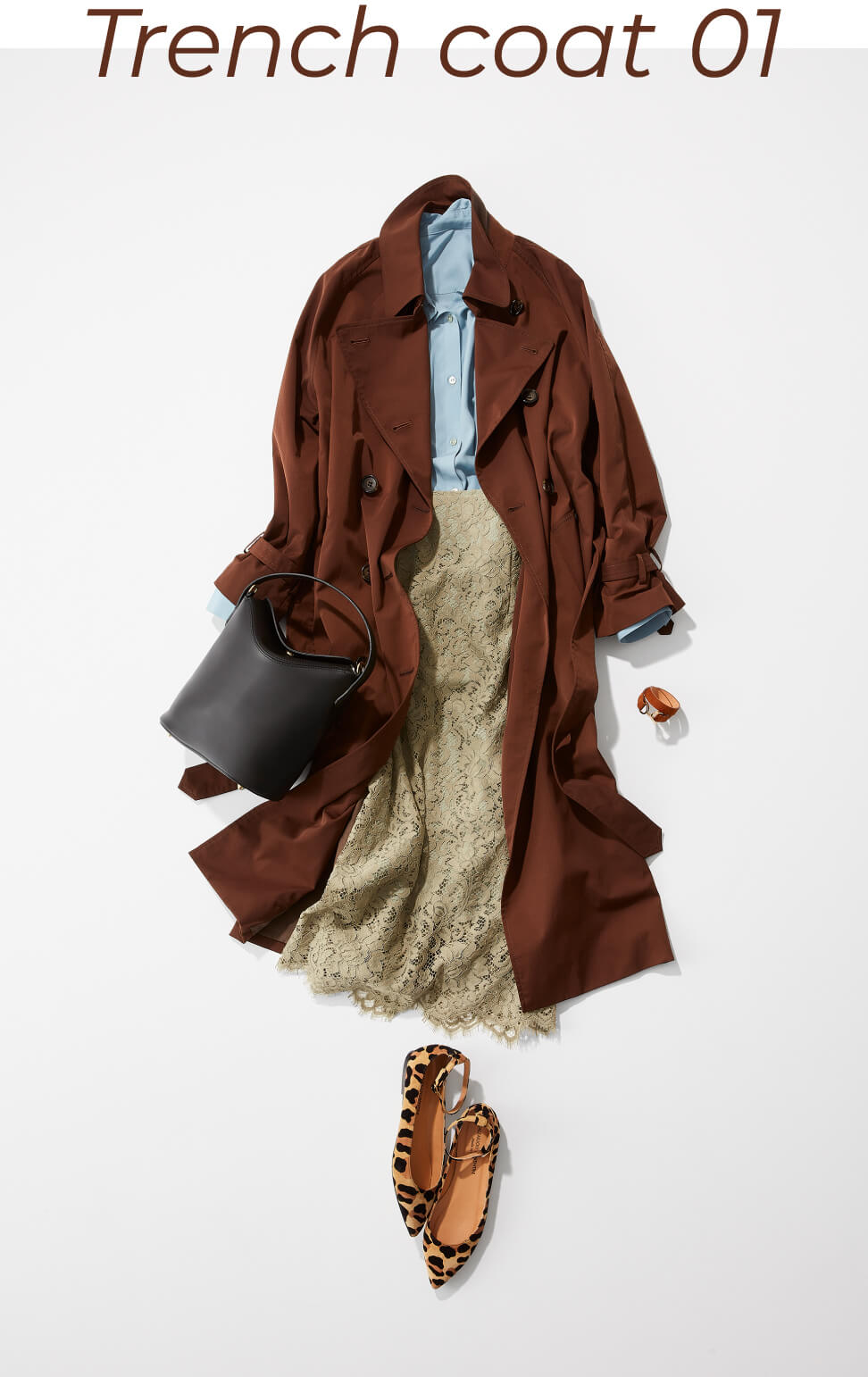 「秋の定番トレンチコートはチョコレートブラウンの色味が絶妙なので、この色を引き立てるスタイリングにトライしました。このチョコレートブラウンは、ミントグリーンをくすませたような“くすみパステル”と好相性。重くなりすぎずにどちらの色もきれいに引き立て、今っぽさを演出してくれます。“できる女風”のスタイリングですが、レースの抜け感でこなれた印象に。足元はパンプスだとコンサバになってしまうので、レオパード柄で遊びをプラスして。」