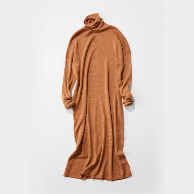 「3WAYで使えるグレーのニットをポンチョ風にコーディネート。合わせたのはニットワンピースです。今秋はニットonニットのレイヤードが新鮮。これまでニット同士の組み合わせといえば、トップス+カーディガンしか選択肢はありませんでしたが、明らかに形が違うニットアイテムを組み合わせることで、ほっこり見えせず、今っぽい着こなしが叶います。ライトブラウンのポンチョがAライン気味なので、ワンピースはIラインシルエットを選ぶのが、すっきり見えするコツ。」
