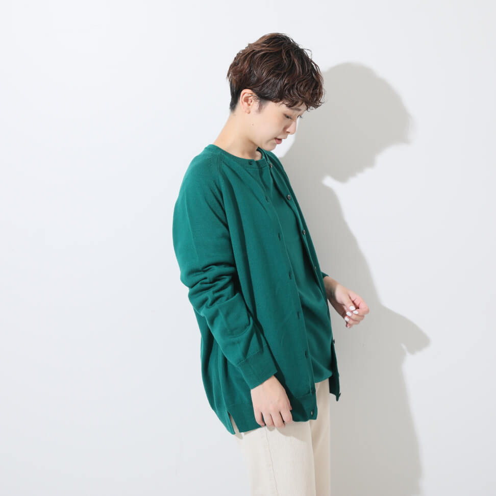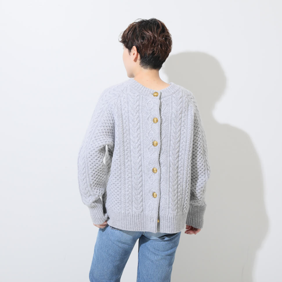 - カーディガンとしてだけでなく、プルオーバーとしても着られる2WAY仕様。アクセントのメタルボタンが後ろすがたも印象的に。あえて前を閉めて、シンプルにデニムと合わせるすっきりとした着こなしが◎。