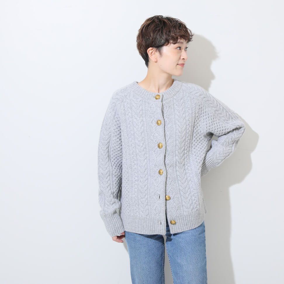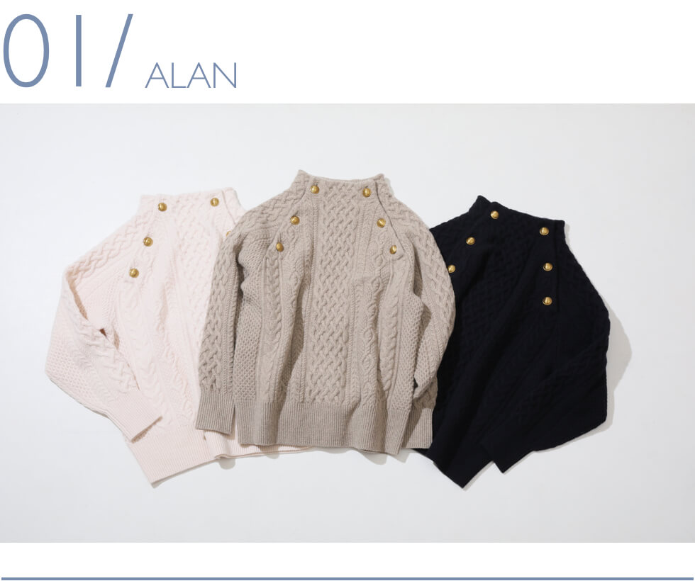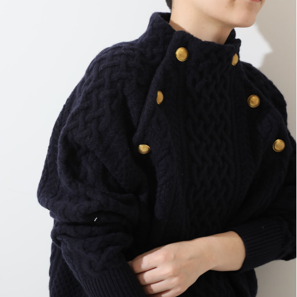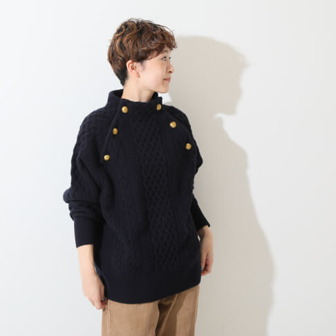 - 1枚であたたかく、表情豊かなアラン編みニット。目を引くゴールドのボタンがほっこりしたムードを回避し、絶妙なハイネックとのバランスも新鮮。知的なネイビーで大人トラッドにまとめたい。