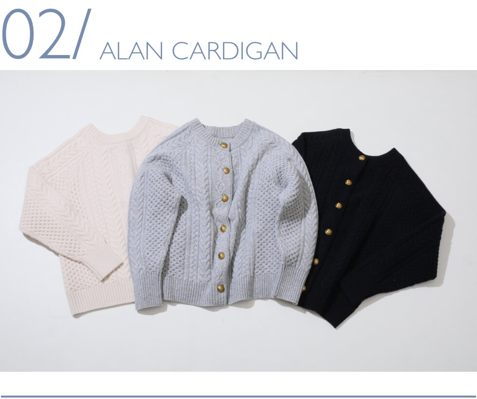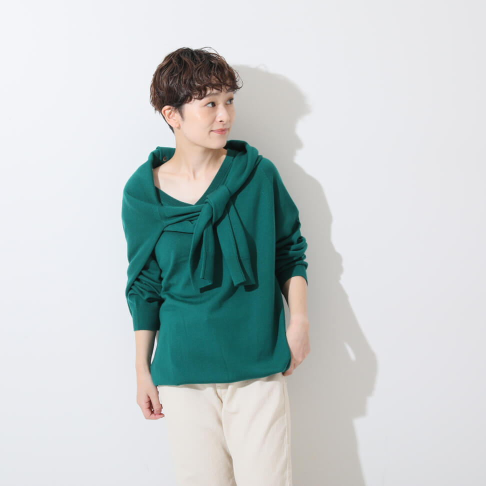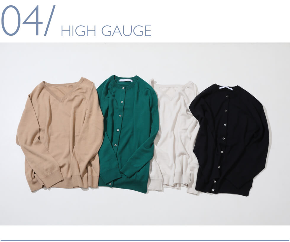 - キレイめな佇まいから、オンオフ問わずに着回せるハイゲージタイプはワードローブのお助けニット。今買うなら、単品でもセットでも着られるアンサンブルがオススメ。カーデはラフに肩からかけると印象がガラリと変わります。