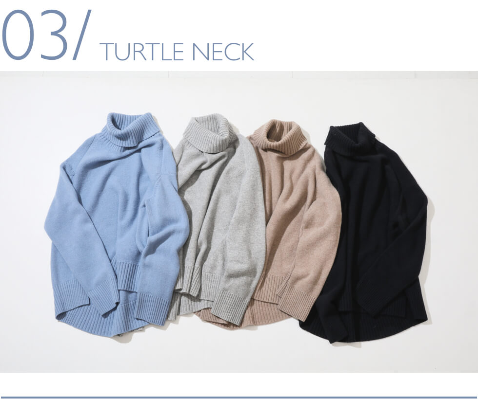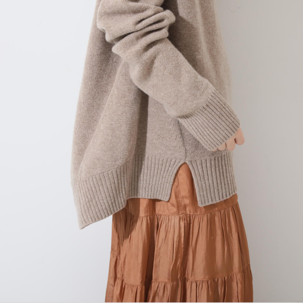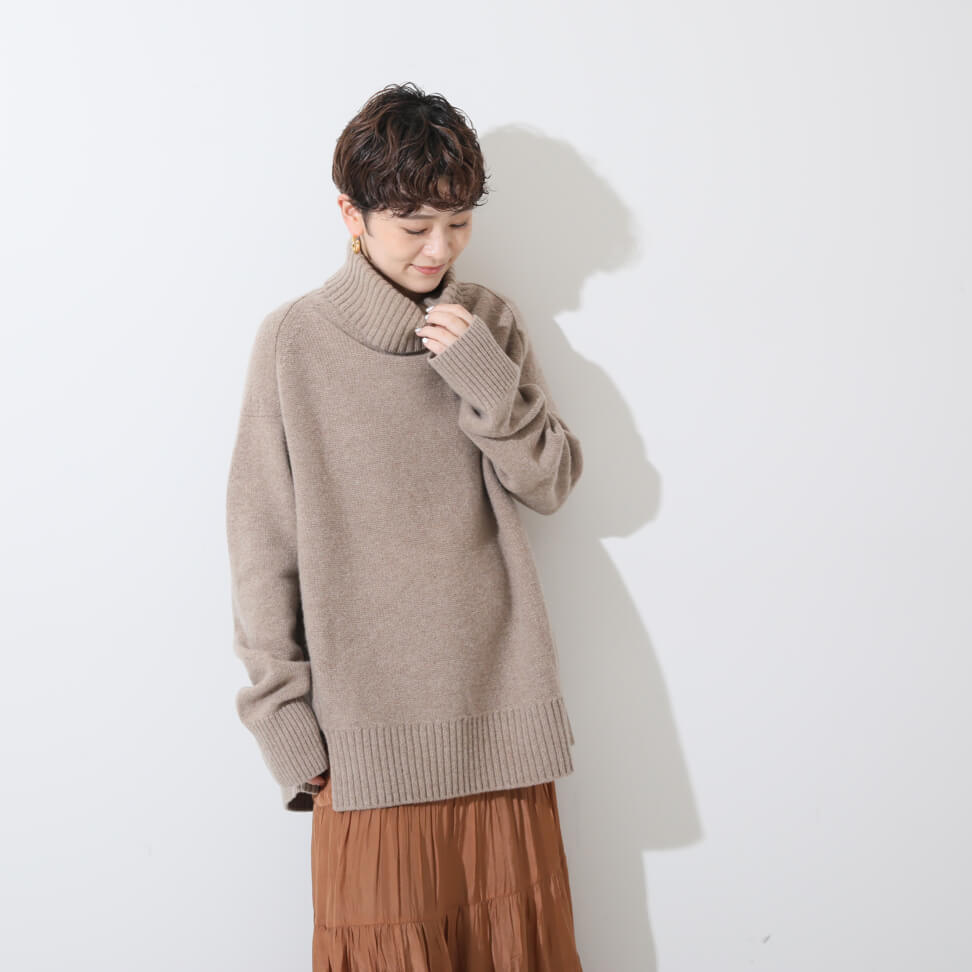 - ベーシックニットとして欠かせないタートルネックは、トレンドのくすみカラーを持っておけば間違いなし。ベージュはさらに本命色。テラコッタのスカートで旬のブラウンコーデを完成させて。