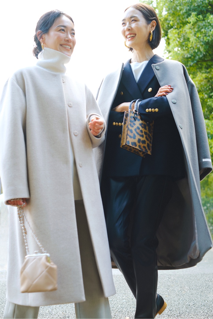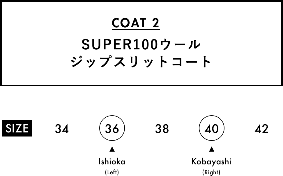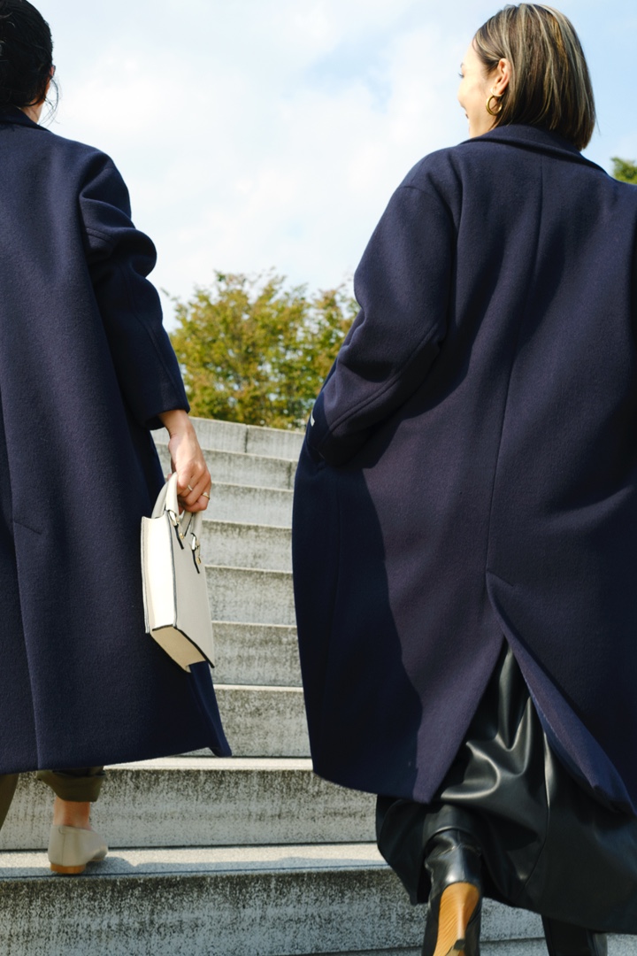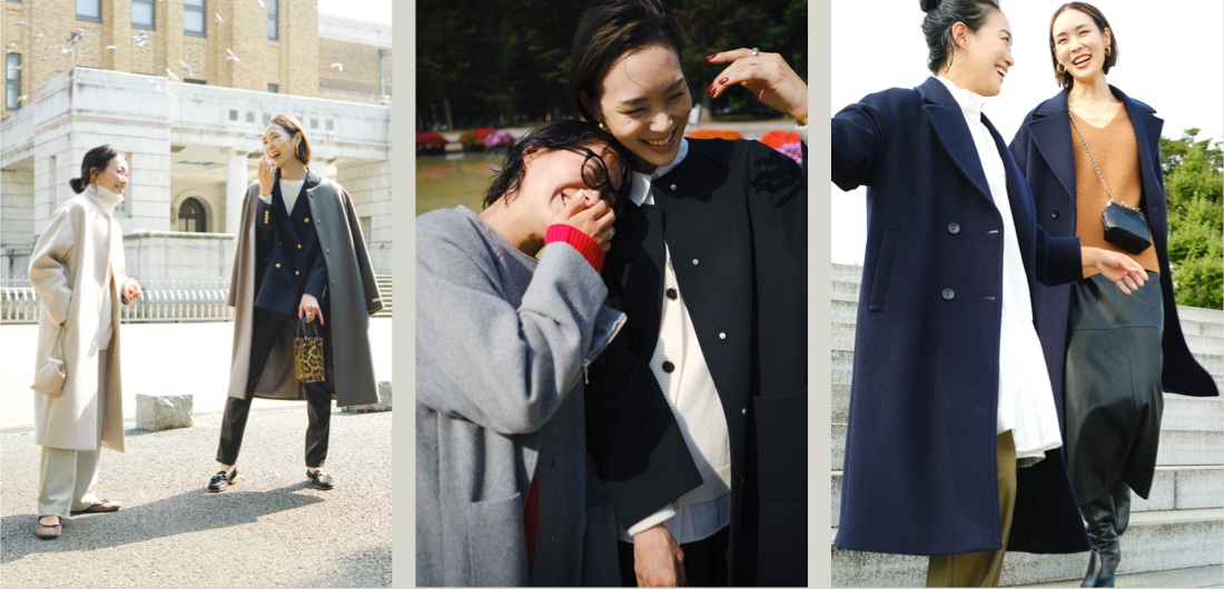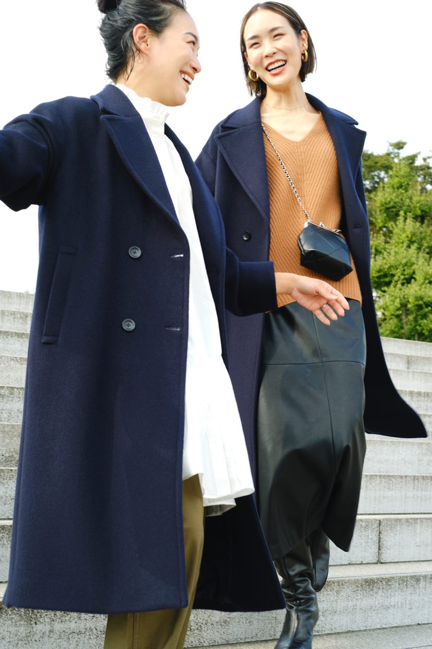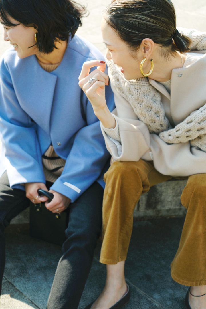 妥協せずにお気に入りを選べるサイズ展開は、34サイズから42サイズまでのなんと5バリエーション! 自身の体型にフィットしたセレクトができるのはもちろん、同じコートでも身幅や着丈のバランスのちがいを楽しむことも。ジャストサイズでシルエットの美しさを活かしたり、いつもよりワンサイズ大きめを選んでゆったりと旬なムードで楽しんだり。合わせるアイテムや着こなしのイメージに寄り添うベストサイズを。156cmの石岡さん、171cmの小林さんのサイジングや、ふたりのさりげなく今っぽいカジュアルスタイリングもぜひご参考に。