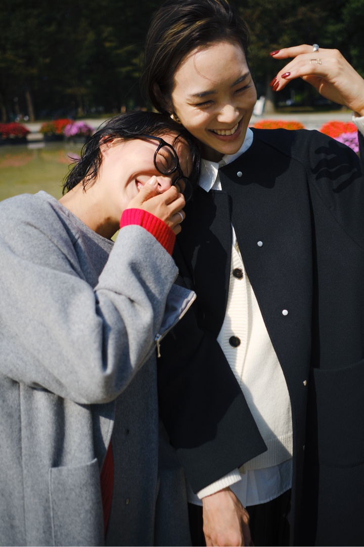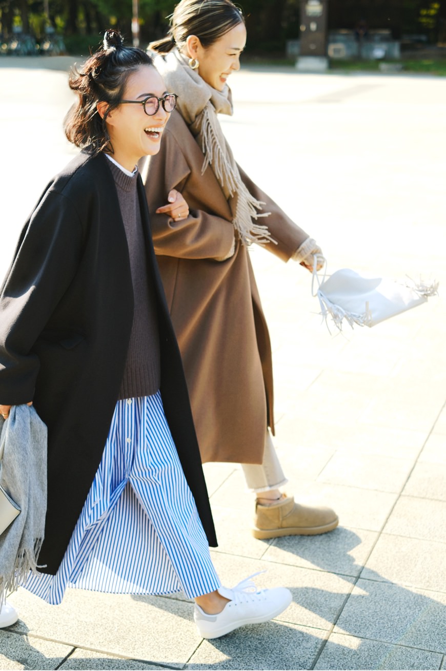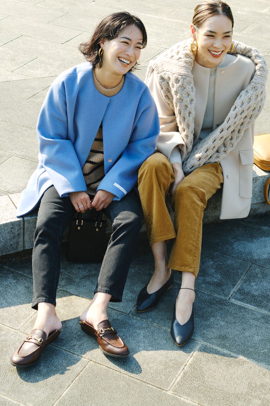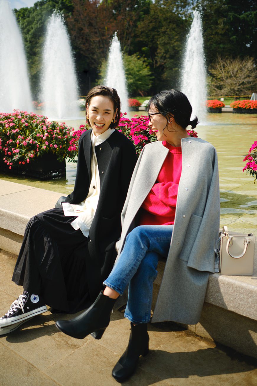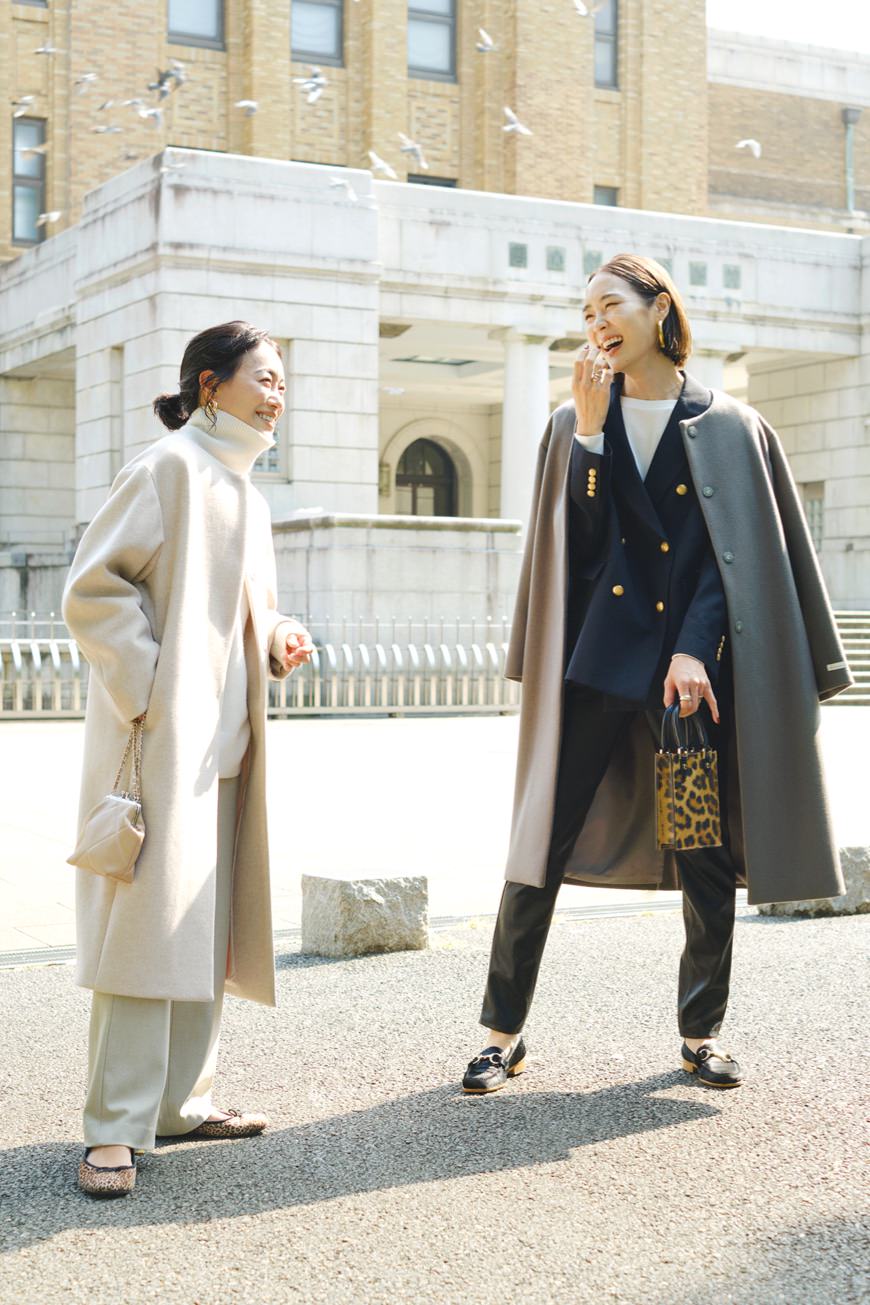 妥協せずにお気に入りを選べるサイズ展開は、34サイズから42サイズまでのなんと5バリエーション! 自身の体型にフィットしたセレクトができるのはもちろん、同じコートでも身幅や着丈のバランスのちがいを楽しむことも。ジャストサイズでシルエットの美しさを活かしたり、いつもよりワンサイズ大きめを選んでゆったりと旬なムードで楽しんだり。合わせるアイテムや着こなしのイメージに寄り添うベストサイズを。156cmの石岡さん、171cmの小林さんのサイジングや、ふたりのさりげなく今っぽいカジュアルスタイリングもぜひご参考に。