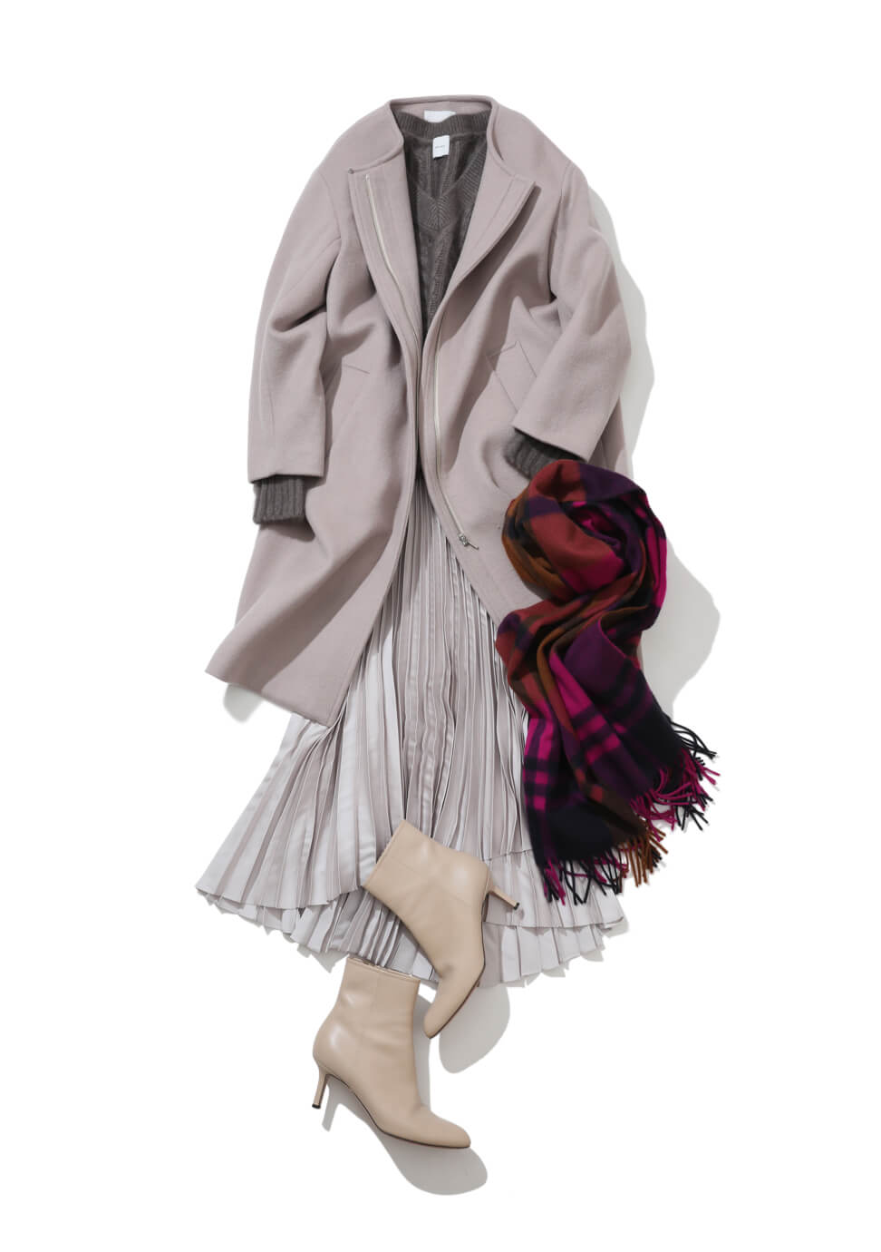 淡めトーンで優しさ漂うオフホワイトを、素材違いで合わせた洗練のニュアンスコーデ。リッチな上質感を醸し出す厚手のノーカラーコートと、光沢とハリをたたえつつ動きのあるプリーツサテンスカートをMIXして、余韻をたっぷり残して。ブーツも、この秋冬トレンドのベージュカラーにトライ。コーデに統一感が生まれ、さらにおしゃれ度アップ!