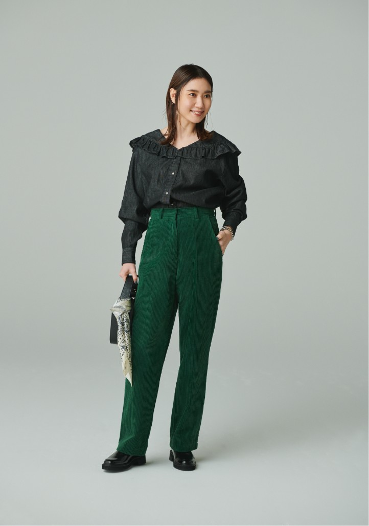 - 「甲にディテールのないシンプルなローファーは、合わせる服との相性を選ばず万能! 素材は高級感のあるガラス加工なのに柔らかくて、驚くほど歩きやすいんです。足元の光沢で、ワイドパンツももっさり見えずシャープに」
