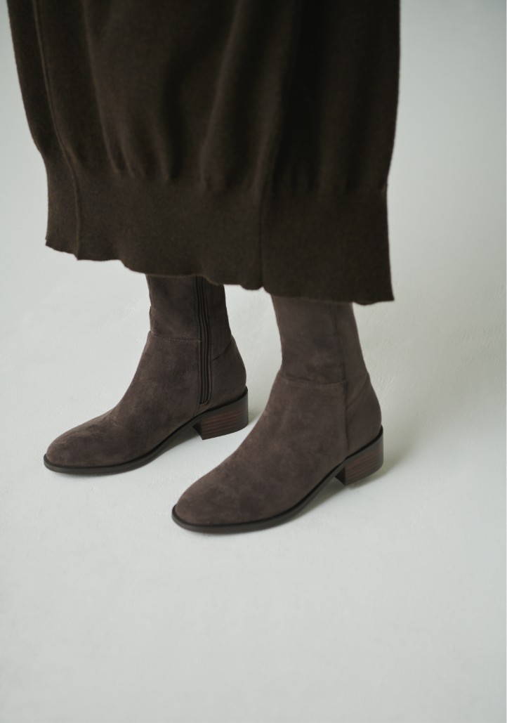 - 「なかなか理想のニーハイブーツに出会えず、ならば作ろう!と完成したのがこの一足。一番こだわったのは、足首の程よいフィット感。パンツをブーツインする時はもちろん、スカートに合わせてももたつかず、脚がすらりと見えます。そして丈に前後差をつけることで、ニーハイならではの脚長効果は生かしつつ、足を曲げても膝裏に負担がかかりにくい仕様に。ストレッチ素材と4㎝ヒールで履き心地も大満足です」