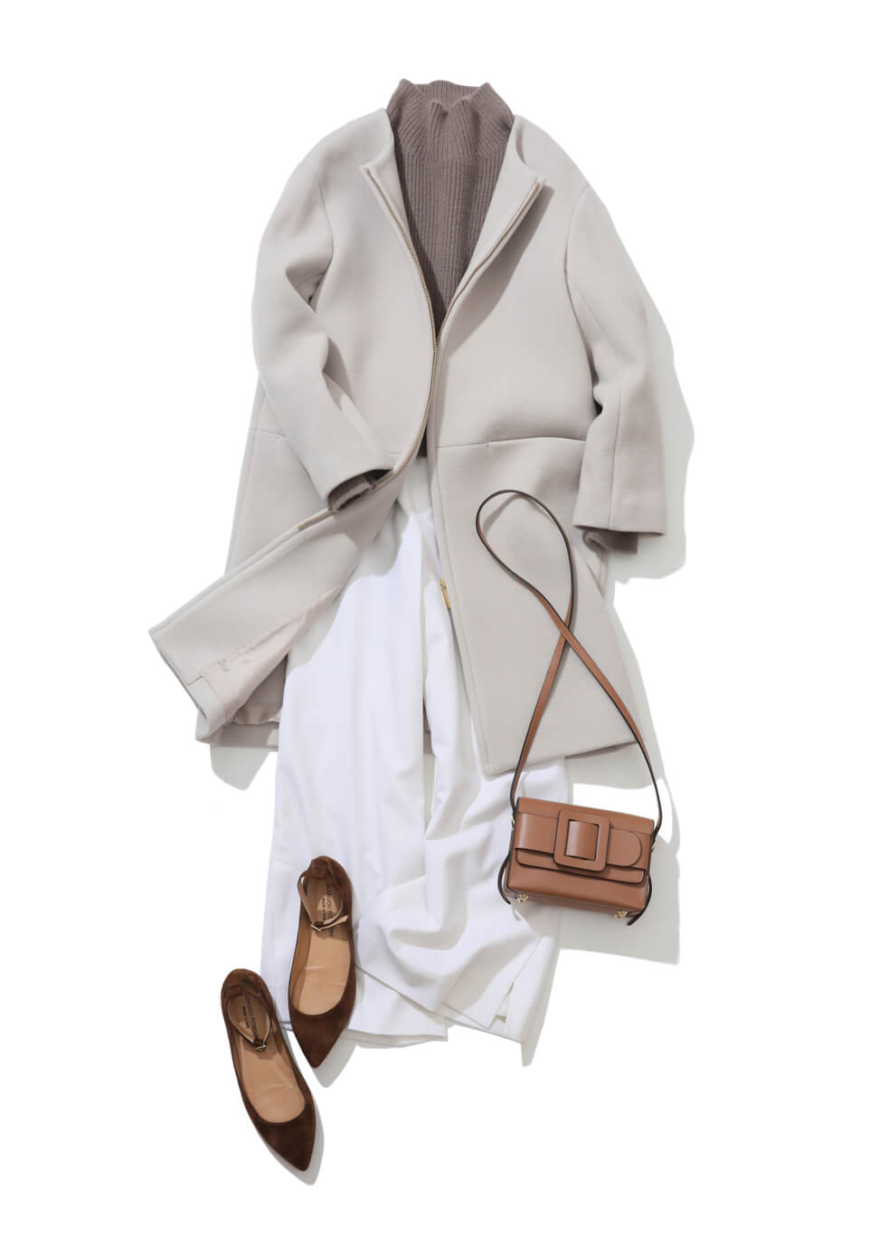 同性にも異性にも好印象をもらえて冬でも活躍する、爽やかな白のストレートパンツ。このシーズンは合わせるアイテムの色味をほんのりくすませて、上質感をキープしつつモダンな雰囲気にまとめるのがおすすめ。頼りになるのがグレージュカラー。ふんわり優しげなカフェラテトーンのアンゴラニットに、ミニマルなノーカラーのグレージュコートを羽織ってしっとりと。