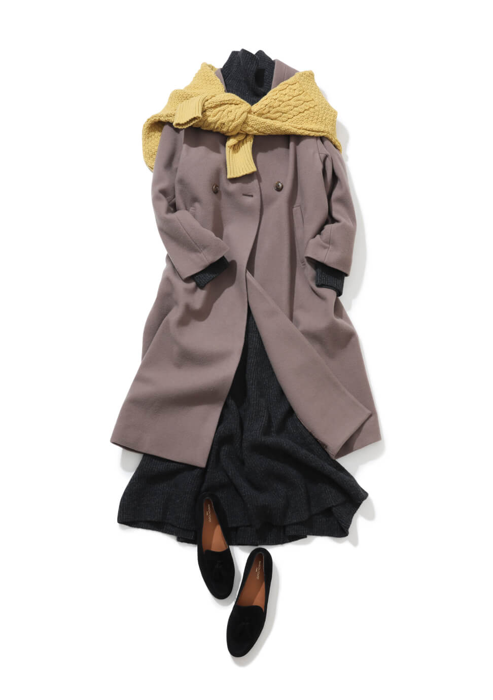 コーデに悩みたくない忙しい朝は、バサっとかぶるだけでコーデが完成するタートルネックニットワンピースの出番。ほんのりフレアに広がったシルエットが、キレイめな女らしさも漂わせてくれる万能ワンピ。Vネックのオーバーコートをさらりと羽織ってすっきりとした首元には、ざっくりニットを肩に巻いて鮮度を高めて。
