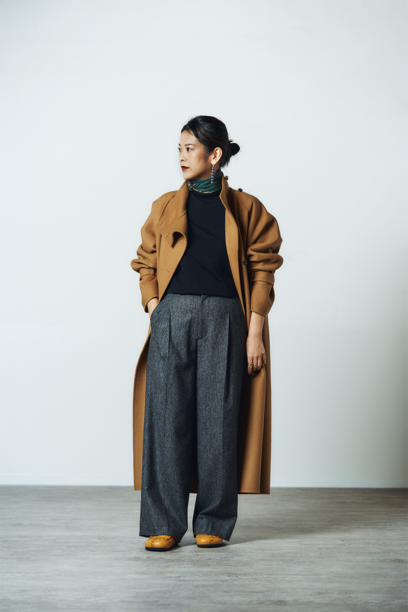 レディな装いロングコートとパンツとのバランスがマスキュリンな印象。スカーフやパールなど女性らしいアクセントを加えることでVERMEILらしさを。