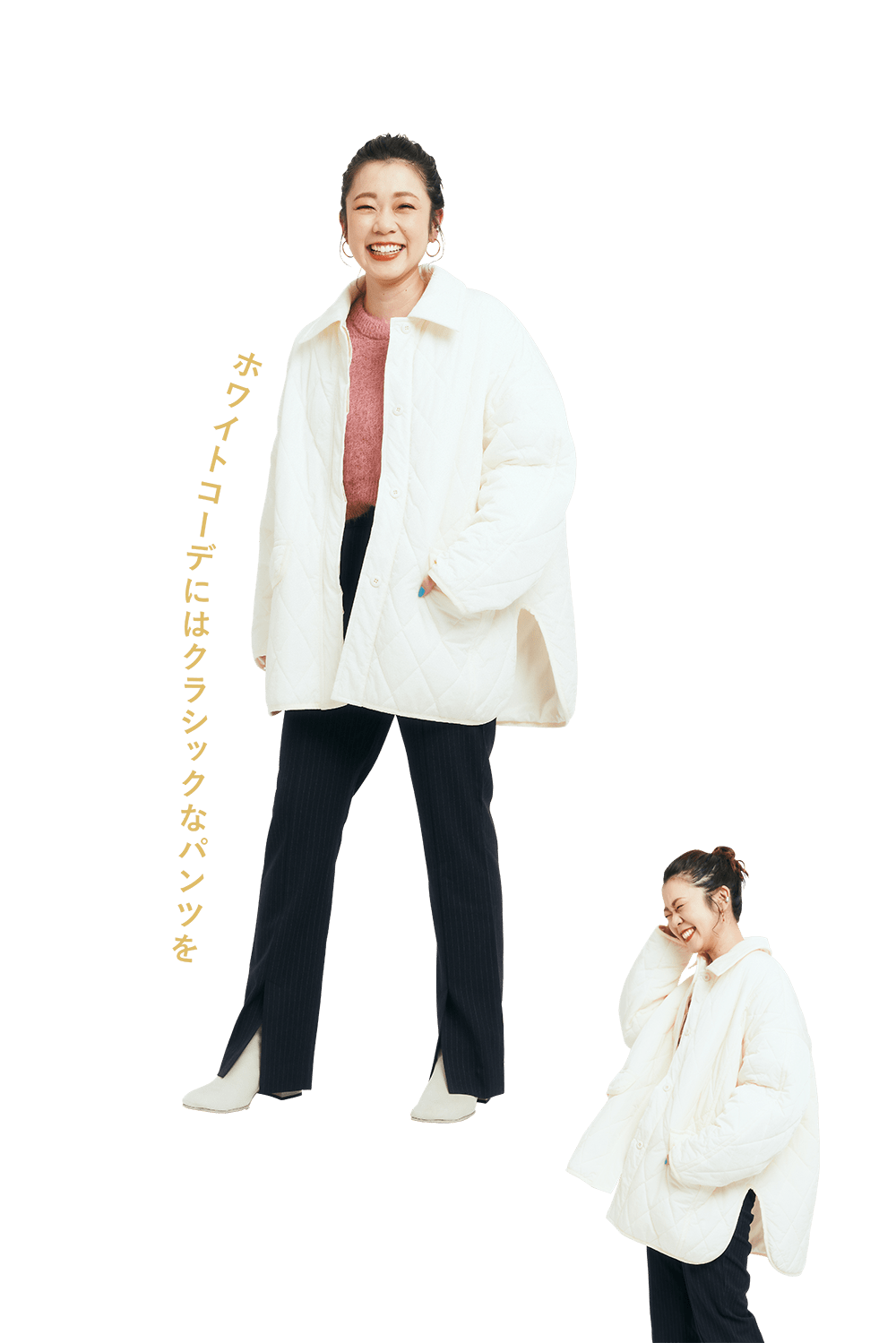 ビジネスシーンでも使われる綺麗な要素を持つキルティングコートを、凹凸のあるニットやイージーパンツでポップな印象に。
