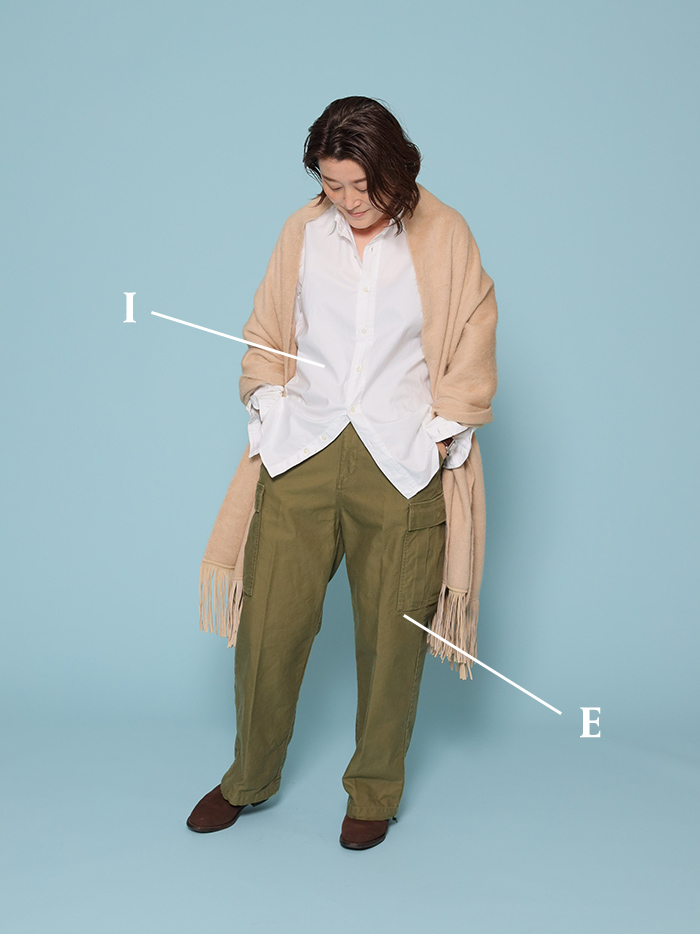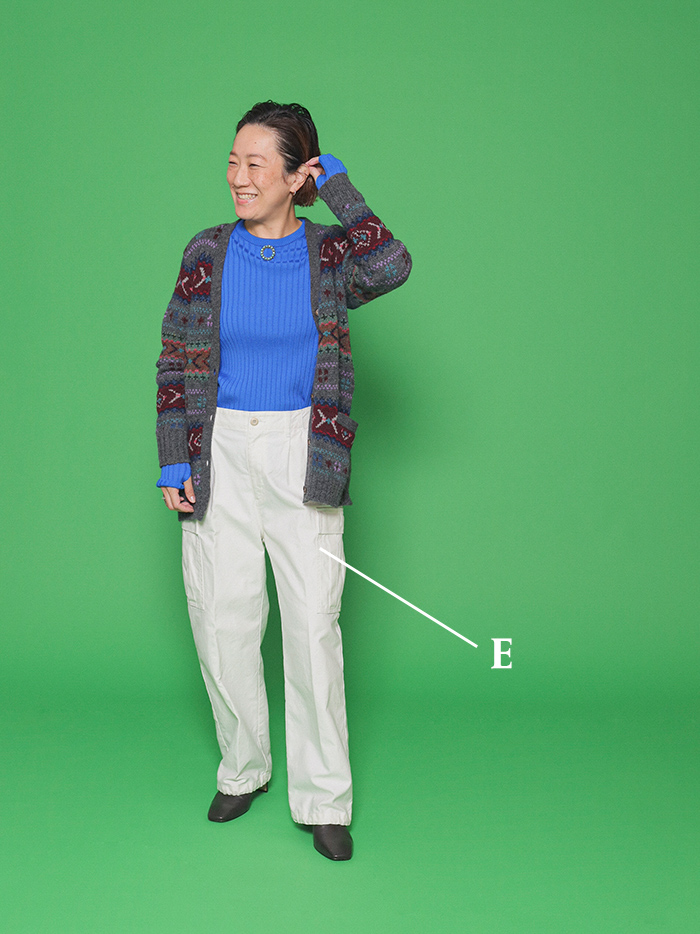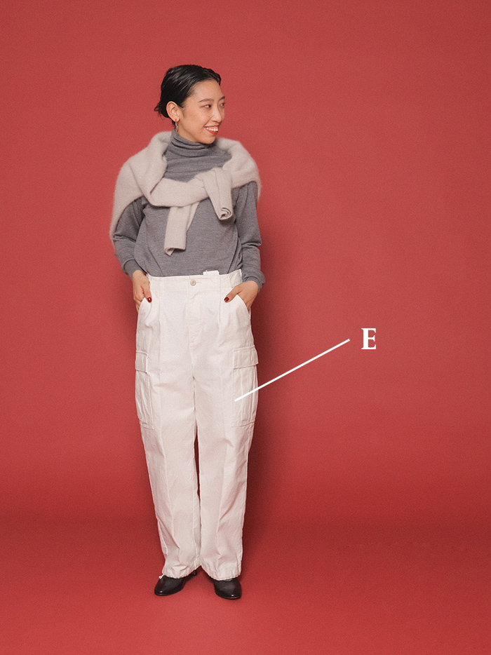 カジュアルなカーゴパンツだけど、クリーンで女性らしく履けるのが魅力。