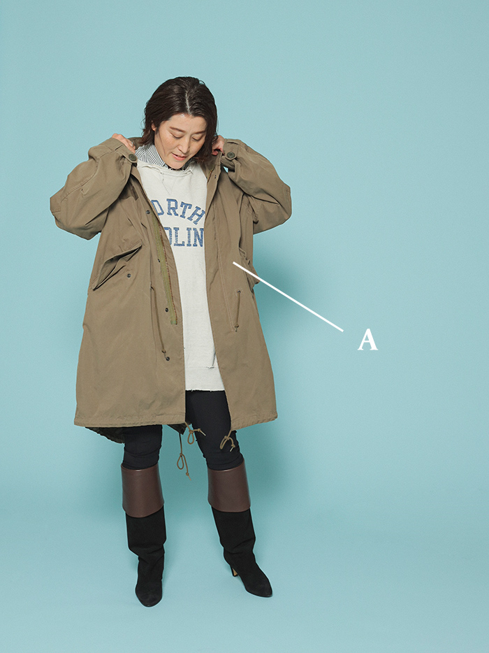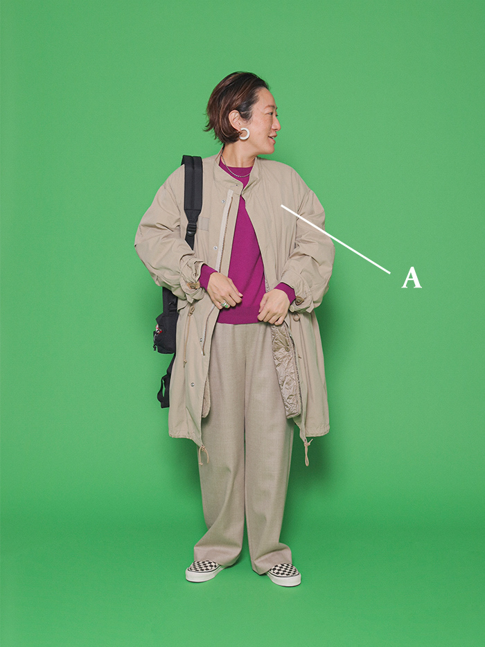 機能性もあるし、ロングシーズン着れる。ミリタリーなデザインだからこそきれめなスタイリングに合わせるのが気分。
