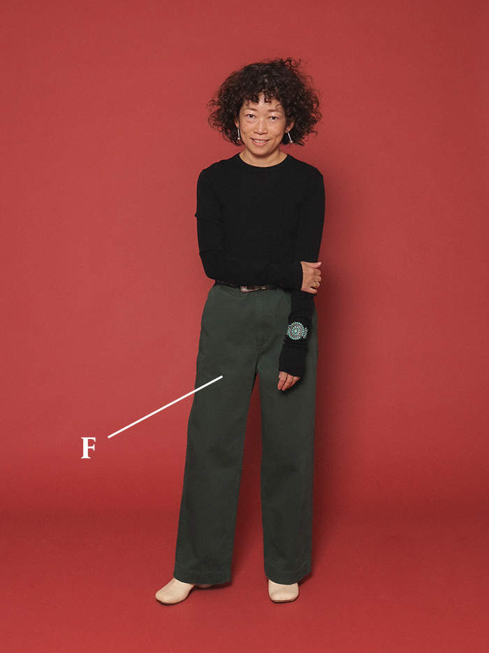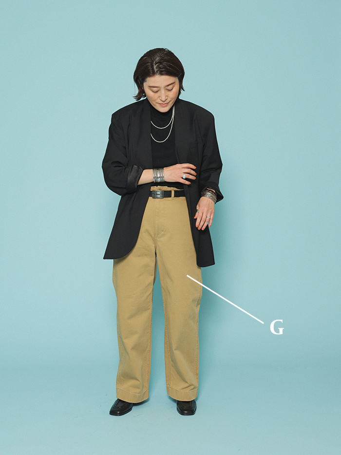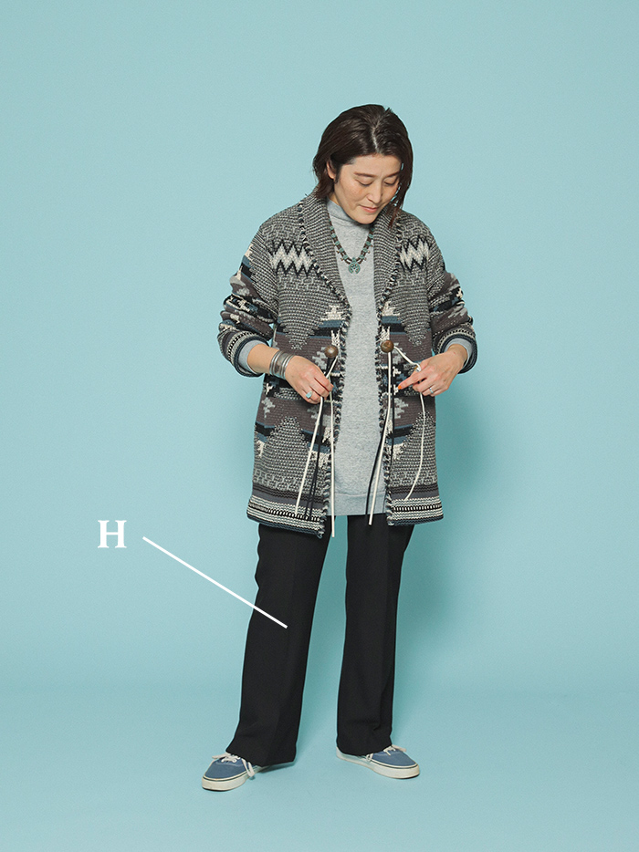 カジュアルにもキレイめにも。ネイティブアメリカンの本格的なジュエリーなどを合わせたスタイリングにも合う。本当になんでも合う万能パンツ。