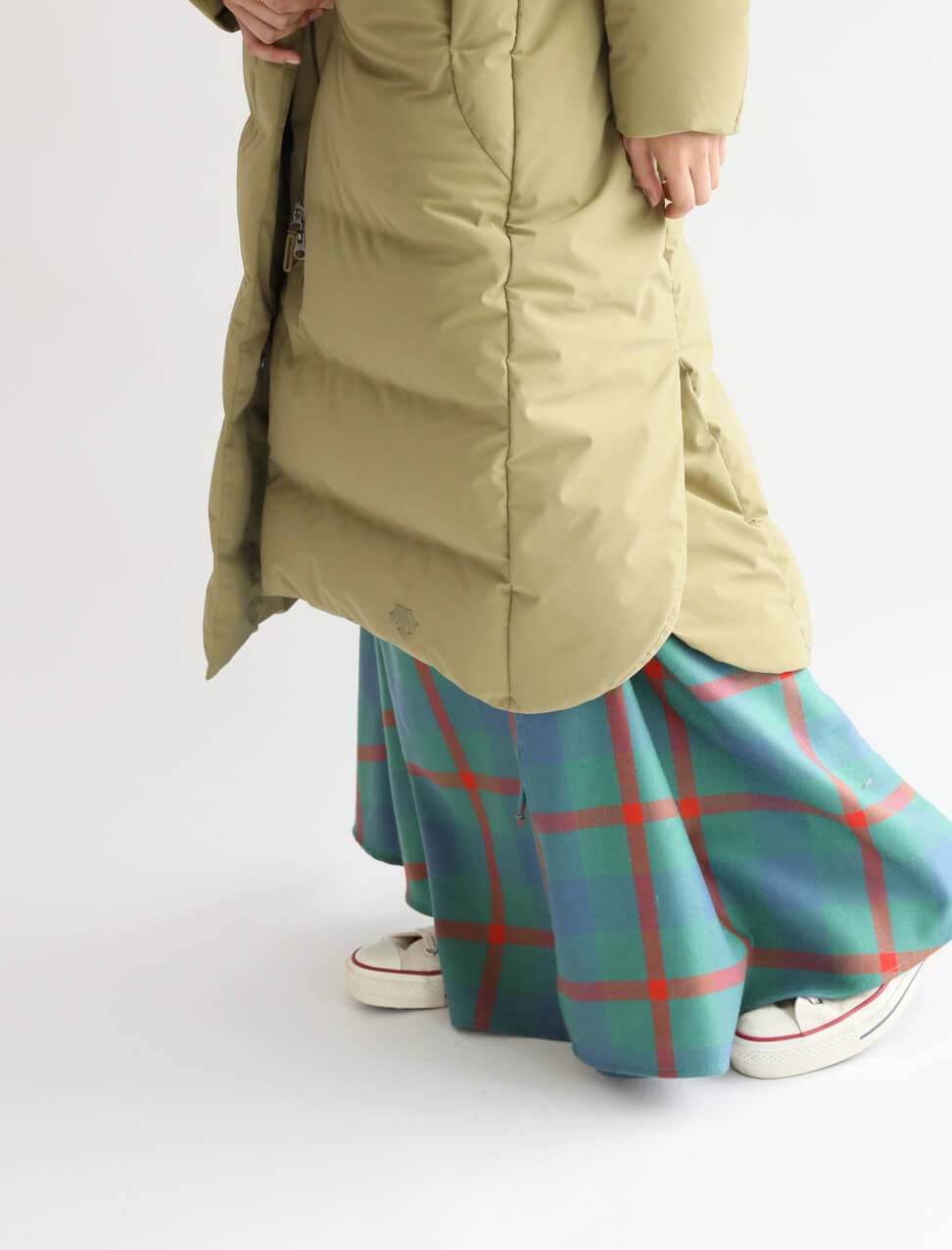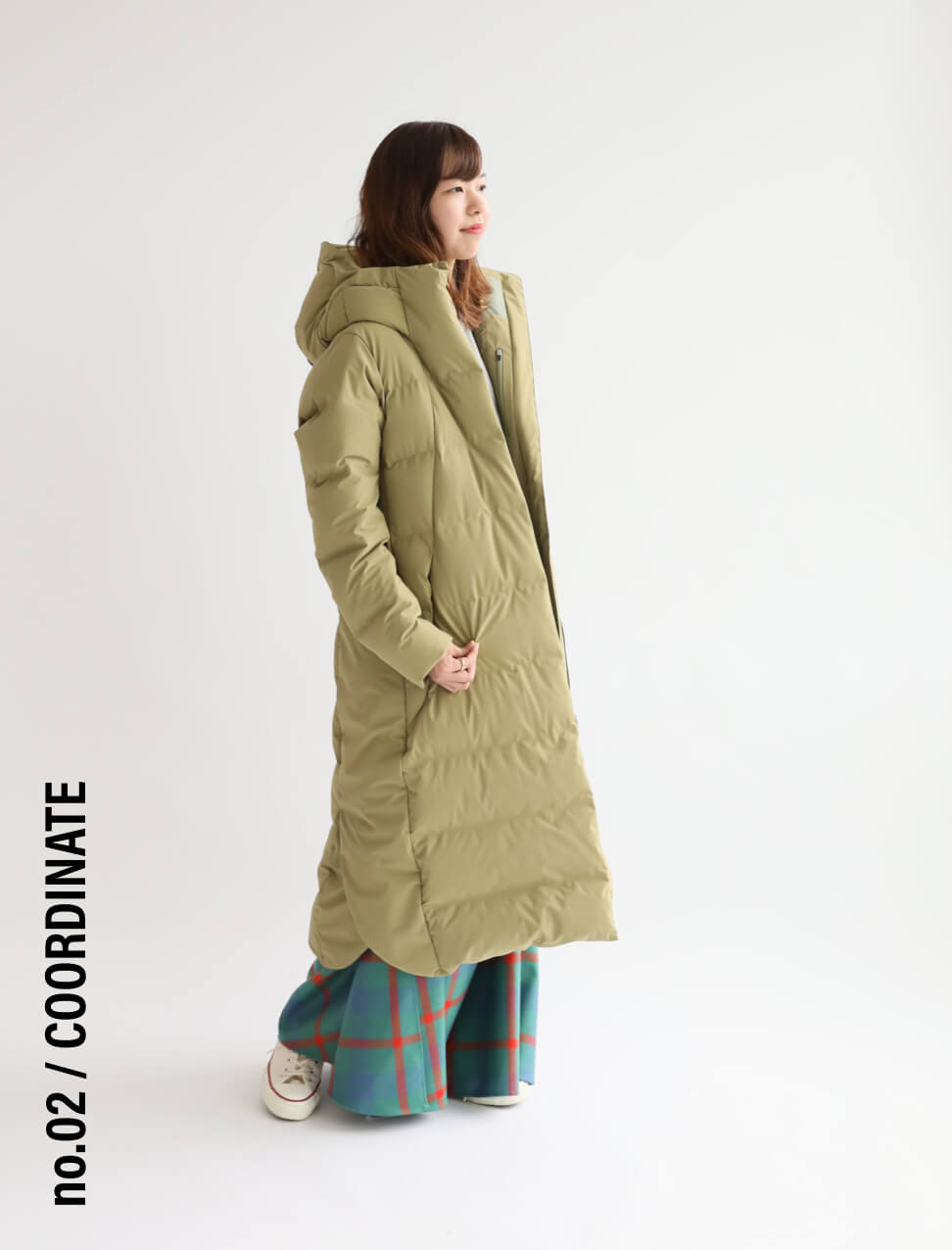 - 今シーズンの新たな別注モデル。女性らしいすっきりとしたシルエットが特徴の人気モデル“ELEMENT”をベースに、着丈を長くしたEX-LONG丈をスペシャルオーダーしました。 Aラインのシルエットにサイドスリットを入れることでこなれ感が加わり、動きやすさも重視したデザイン。 マキシ丈のカラーチェック柄スカートをのぞかせて、トレンドのIラインシルエットをメイク。動きのあるフレアシルエットがムードのあるダウンコーデに。