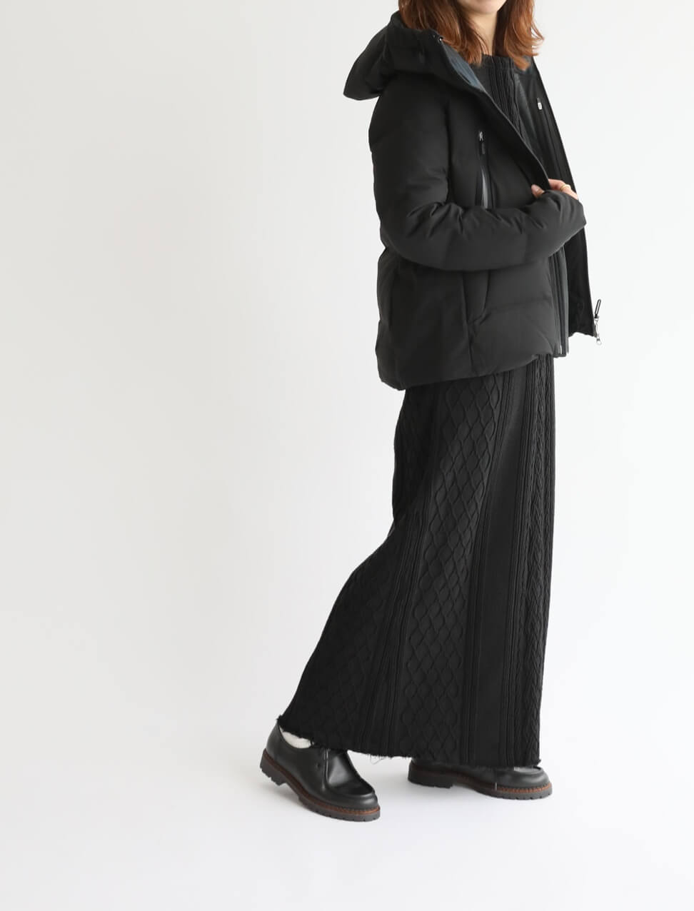 - フランス産ホワイトダックダウン90%とフェザー10%という最もバランスが良いとされる混率と最上級のダウンを使用。さらに熱接着ノンキルト加工とシームテープ加工によって、高い耐水性を実現。さらにシームレスのデザインだから、ダウンの羽根が抜けることなく着用可能できるなど、随所にこだわったスペックの高さが魅力。 上半身にボリュームをもたせたコンパクト丈が脚長効果をもたらす、マキシスカートをレイヤード。スカートと同素材のトップスを合わせたオールブラックのモードな雰囲気が新鮮です。表情のある編み地や素材でコーデにリズムを加えて。