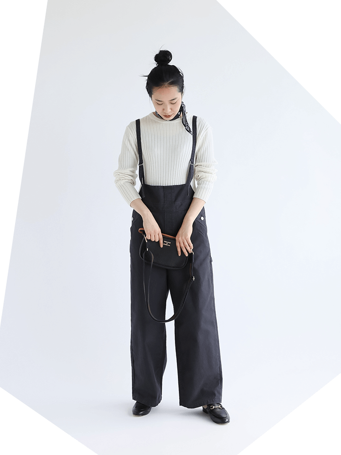 ミニマルなサロペットはコンパクトなニットと合わせてすっきりと。モノトーンでまとめればシックで大人っぽい雰囲気に。シンプルコーデには首元のスカーフでアクセントを加えて。