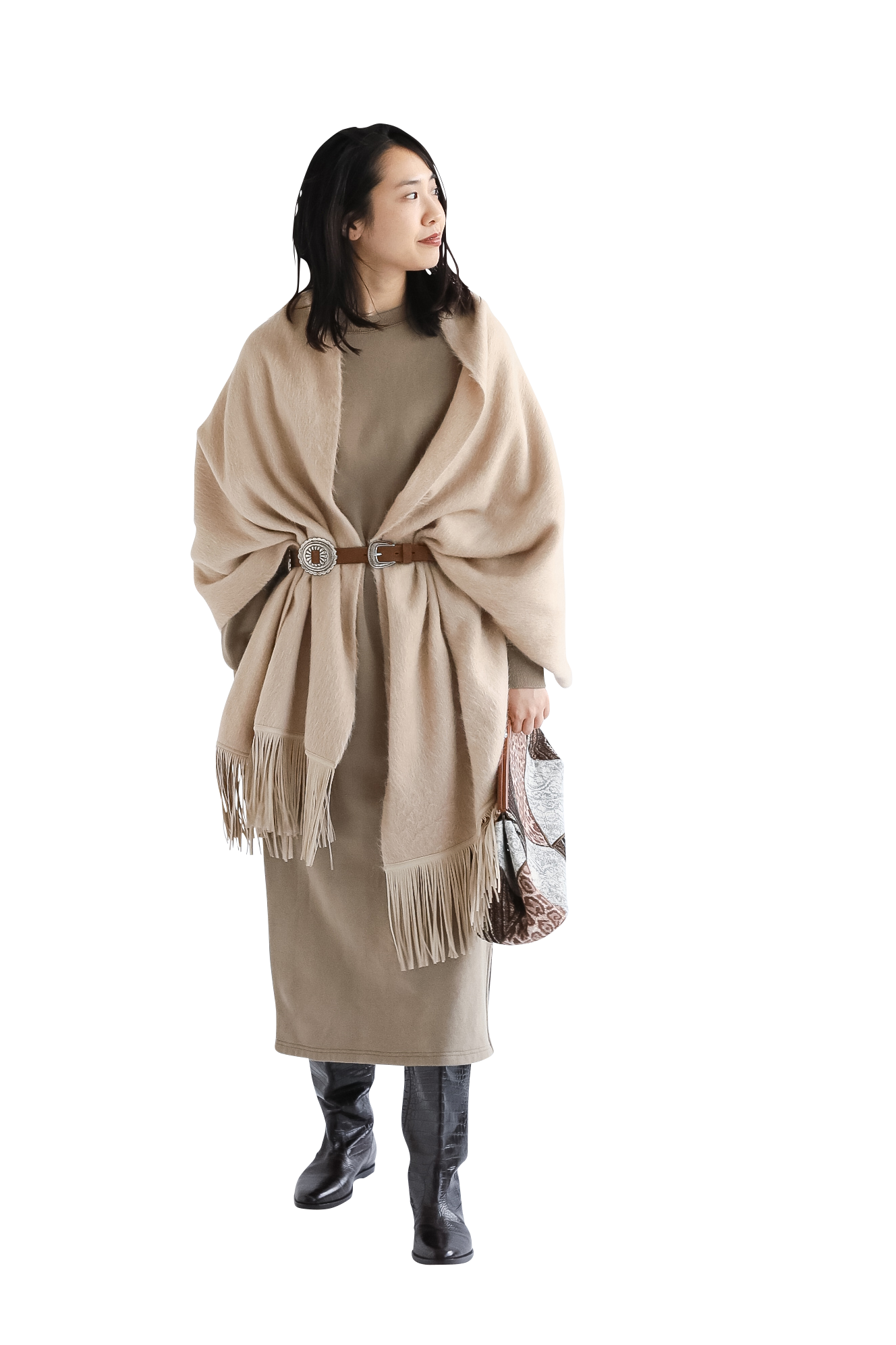 ラフな印象のスウェットワンピースには大判ストールとコンチョベルトをオン。ピリッとスパイスが効いた女性らしいスタイルに。ブラウン小物とのグラデーションコーデで抜け感たっぷりに仕上げて。