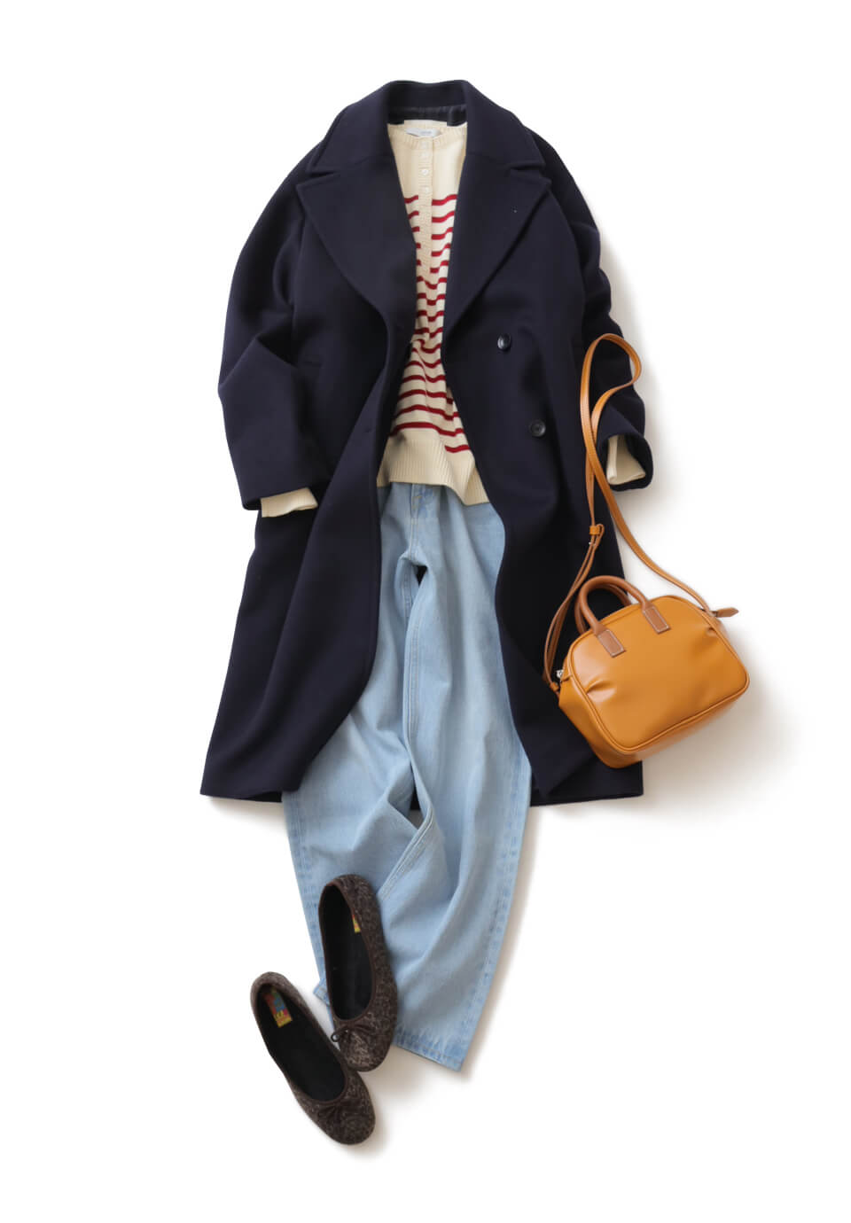 毎年恒例、地元友達の新年会へ。去年はオンラインだったけれど、今年はリアル開催ということでコーデも抜かりなく。気負わず洒落る、爽やかなレッドのパネルボーダーニットにブルーデニムを合わせたフレンチカジュアルなら、好印象ゲットは確実。ハンサムコートをバサっと羽織ってスタイリッシュなムードも上乗せして。