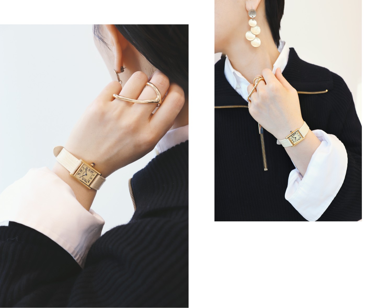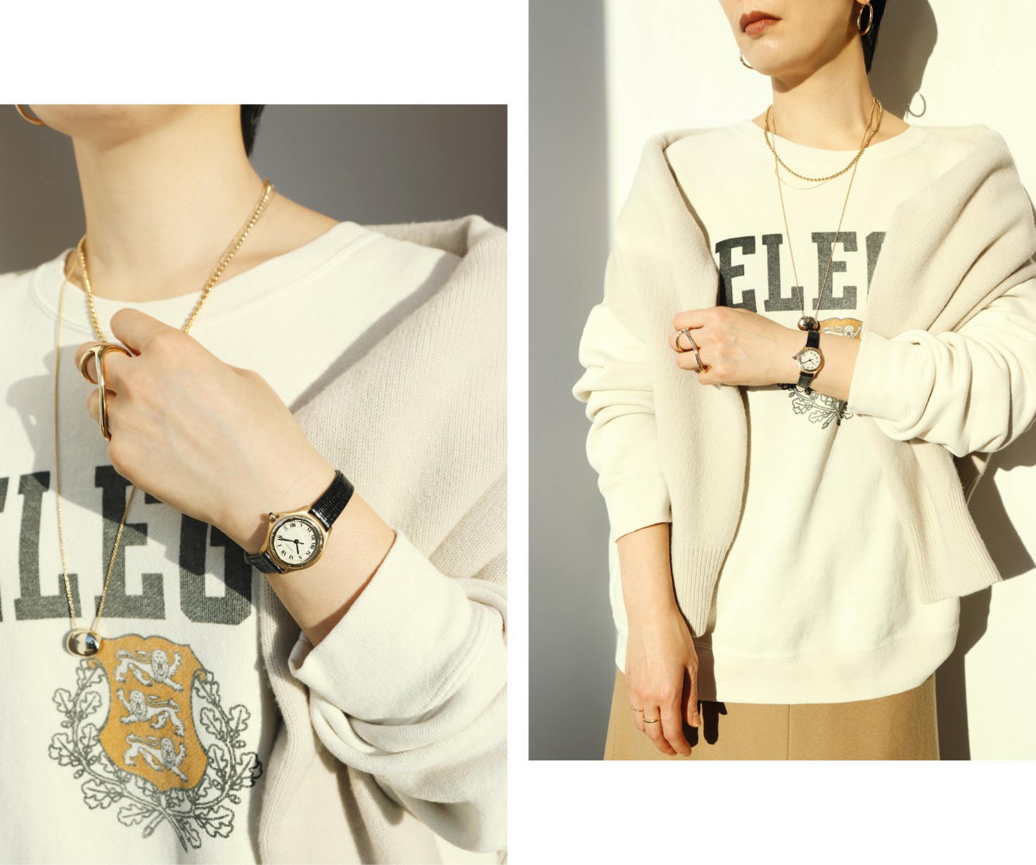 18kイエローゴールドのウオッチに合わせて、コーデもゴールドアクセサリーとベージュアイテムで統一感をもたせて。