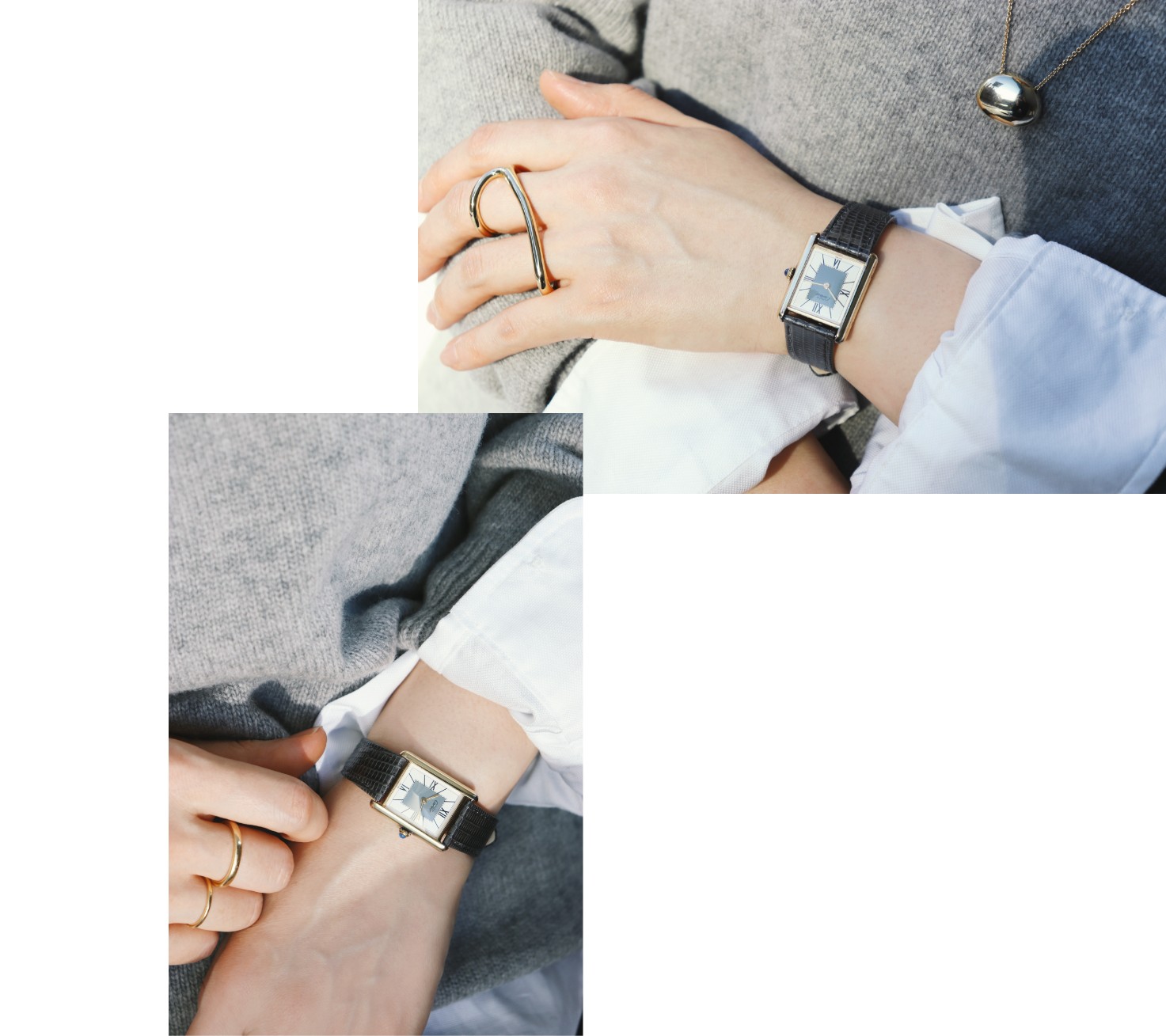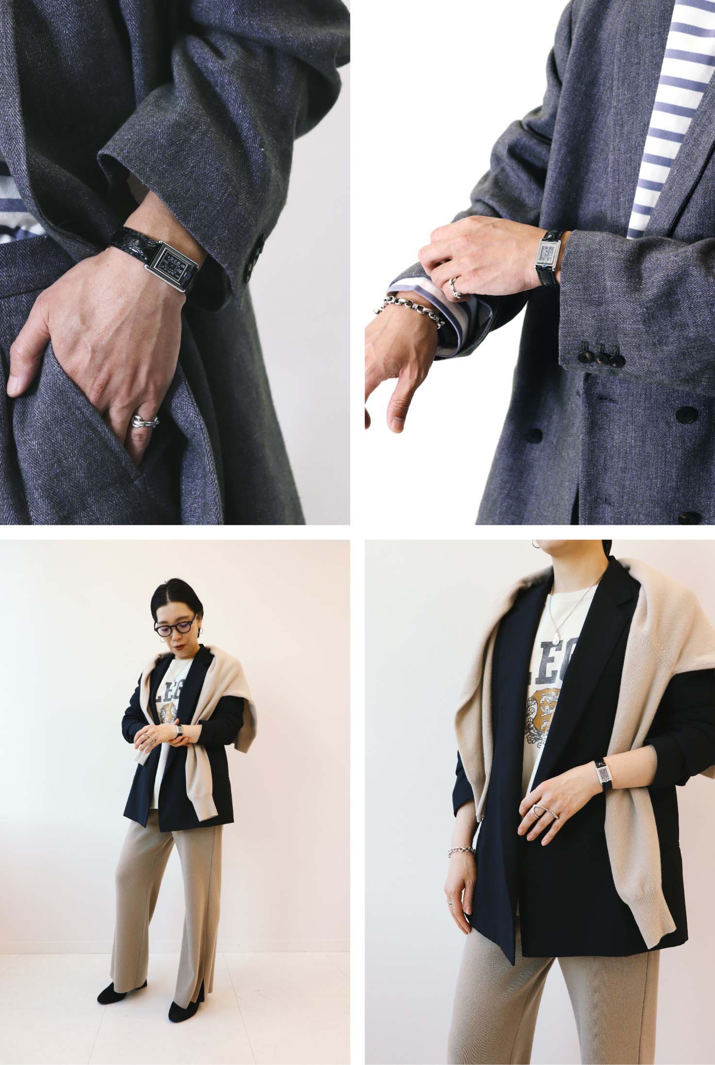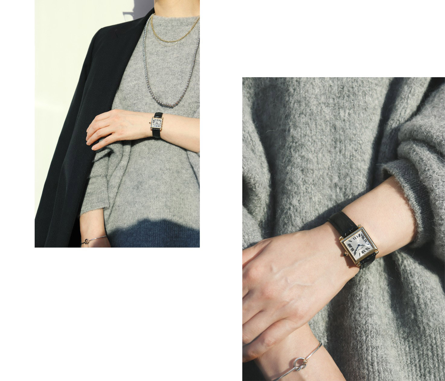 正方形に近いレクタンギュラーの絶妙なサイズ感が馴染み良く、ネイビーのレザーベルトが上品で凛としたムードを演出。