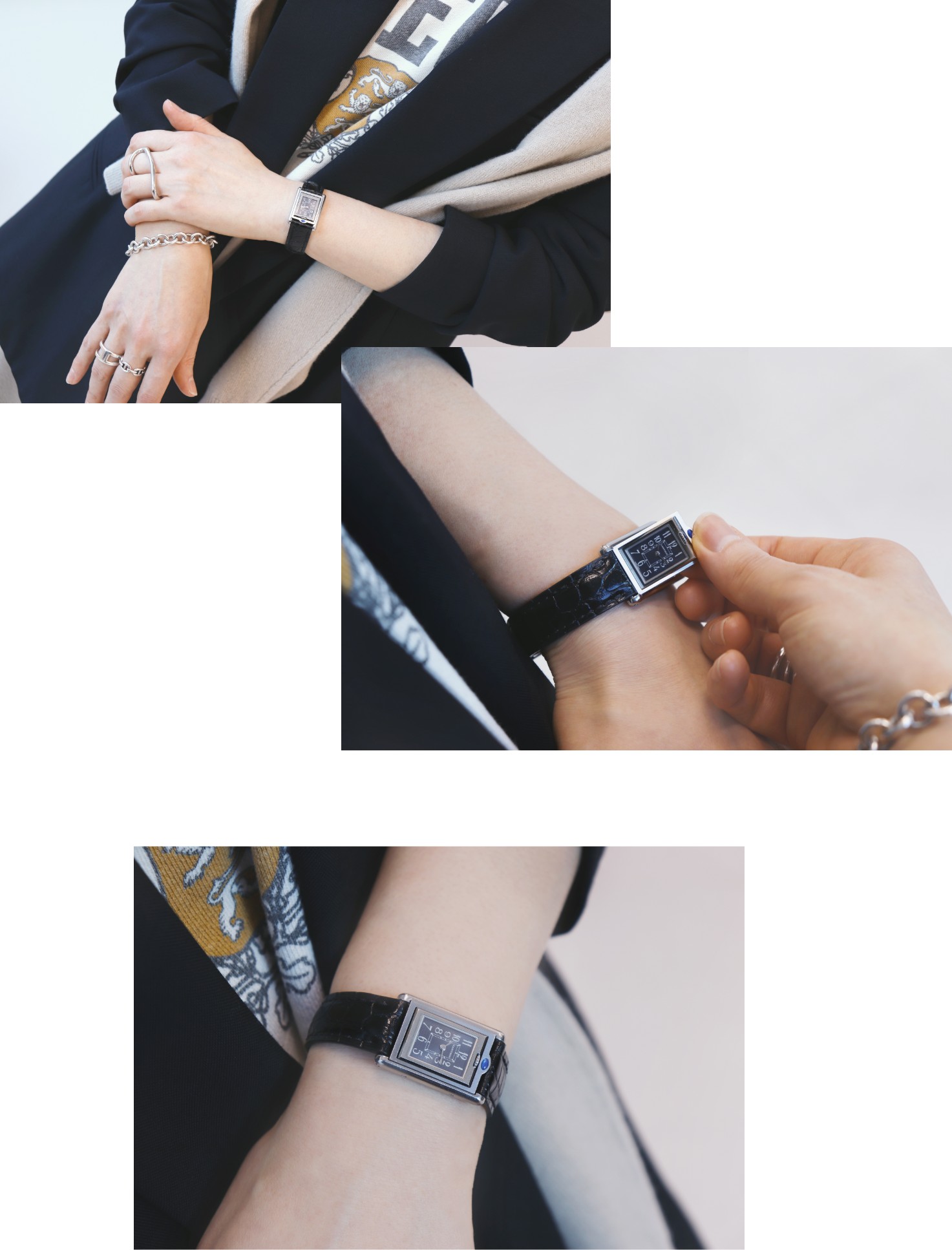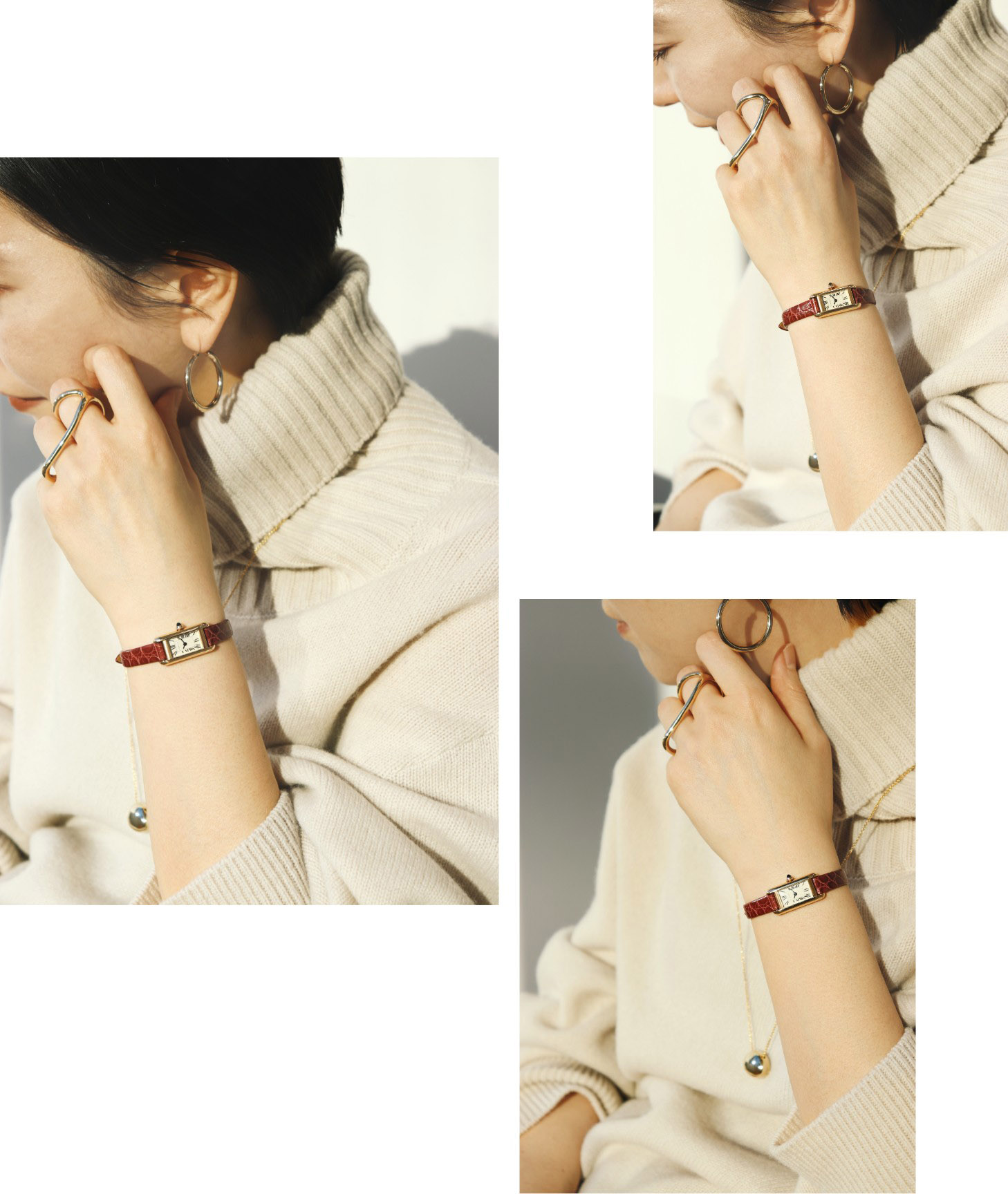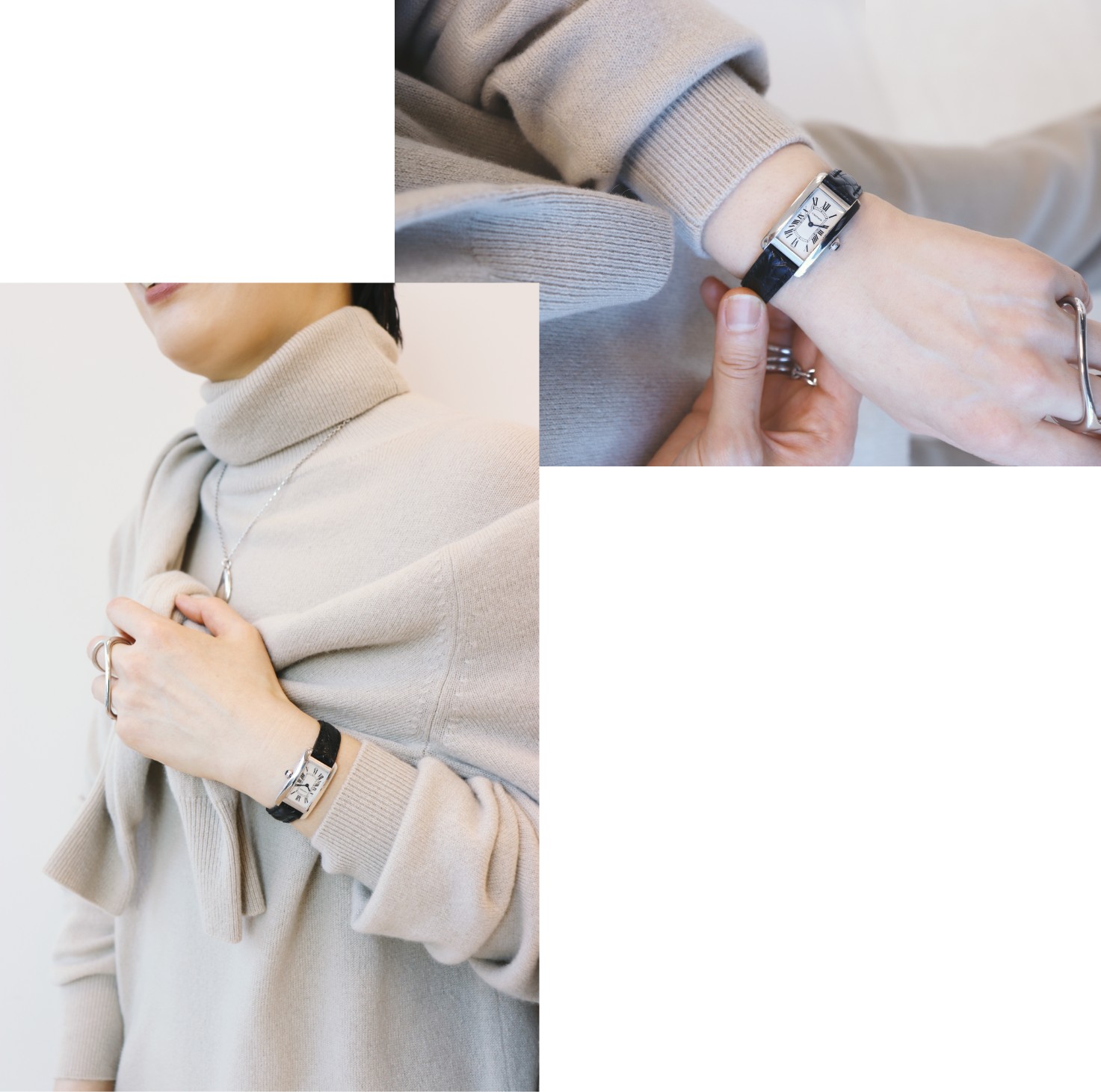 正方形に近いレクタンギュラーの絶妙なサイズ感が馴染み良く、ネイビーのレザーベルトが上品で凛としたムードを演出。