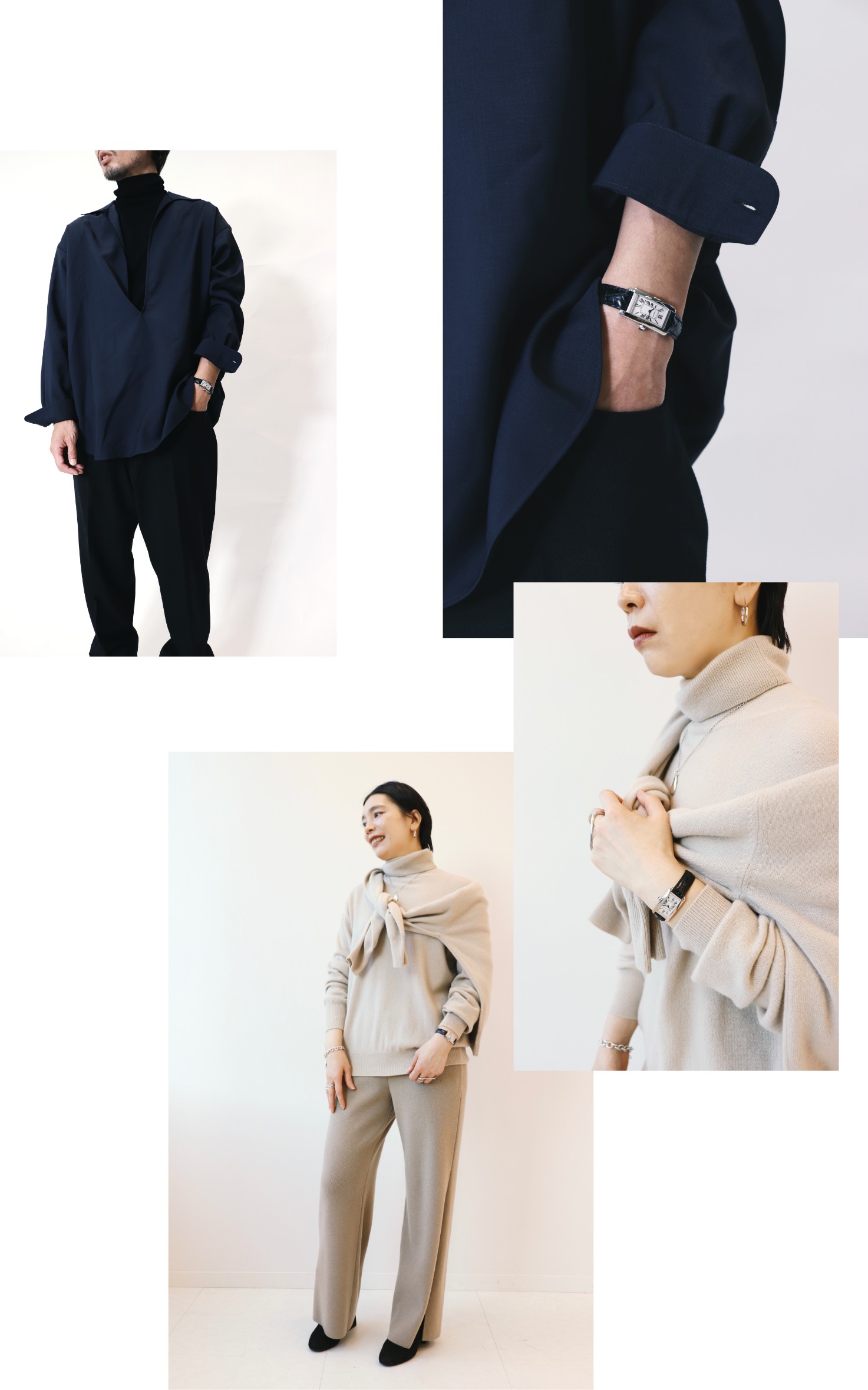 カーブがあるエレガントな佇まいに合わせて、上質ニットの柔らかいグレージュコーデでキレイめに。メンズはフォーマルを意識したネイビーシャツのスタイルに。