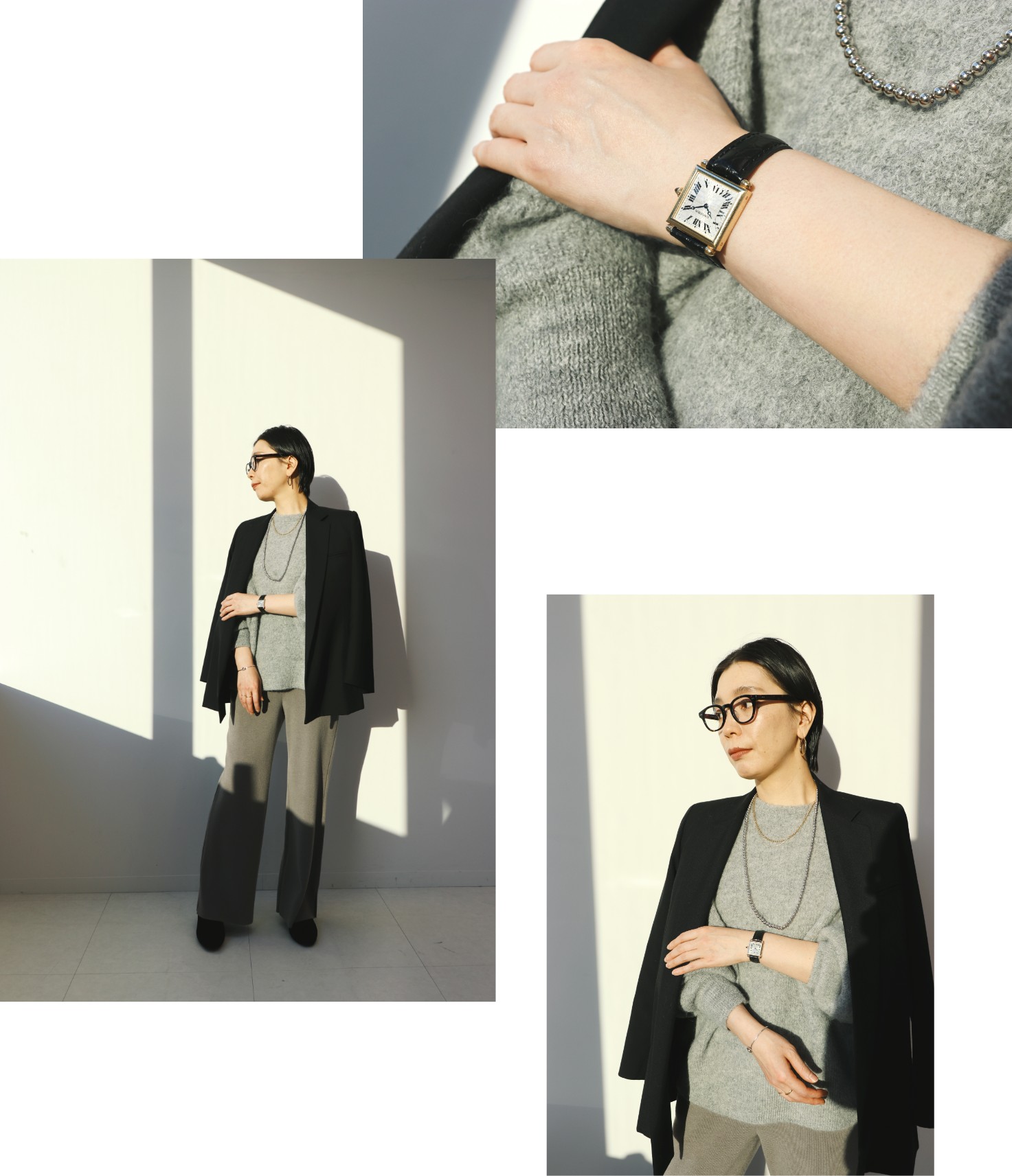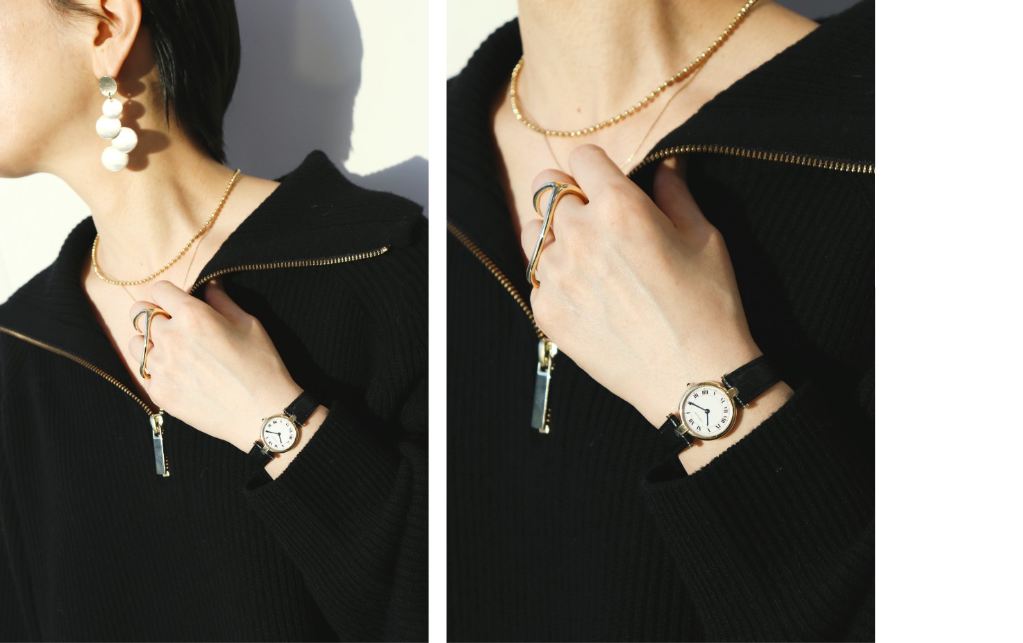 18kイエローゴールドのウオッチとゴールドアクセサリーが映える、ブラックニットを潔く1枚で。
