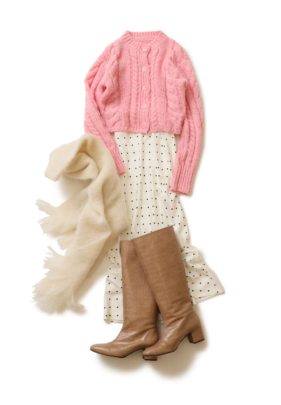 正月ボケがまだまだ抜けないけれど、お世話になっている取り組み先に挨拶回りへ。スウィートなピンクのコンパクト丈ケーブルカーディガンは、華やかさと視線を上にアップさせるスタイルアップの効果も◎。白ドットスカートとベージュ小物をつないで、上品さも漂う大人可愛いスタイルをメイク。