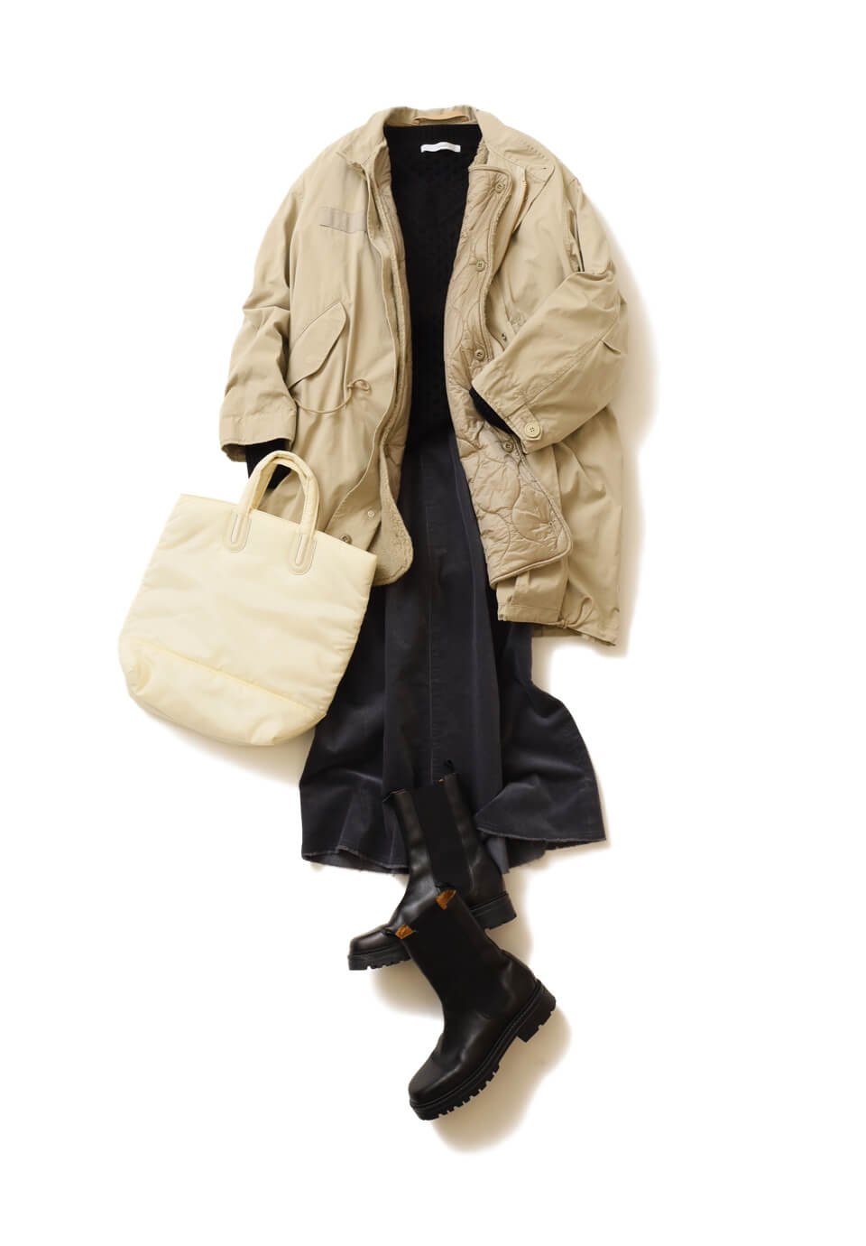 ニット×スカートを黒とダークグレーでまとめた、シックな女っぽカジュアル。ほんのり抜け感を醸す浅めなVネックがちょうどいい肌見せバランス。仕上げに羽織ったのは、メンズライクなオーバーサイズのフィールドパーカ。濃色コーデに映えて、都会的なスポーティームードを味付け。