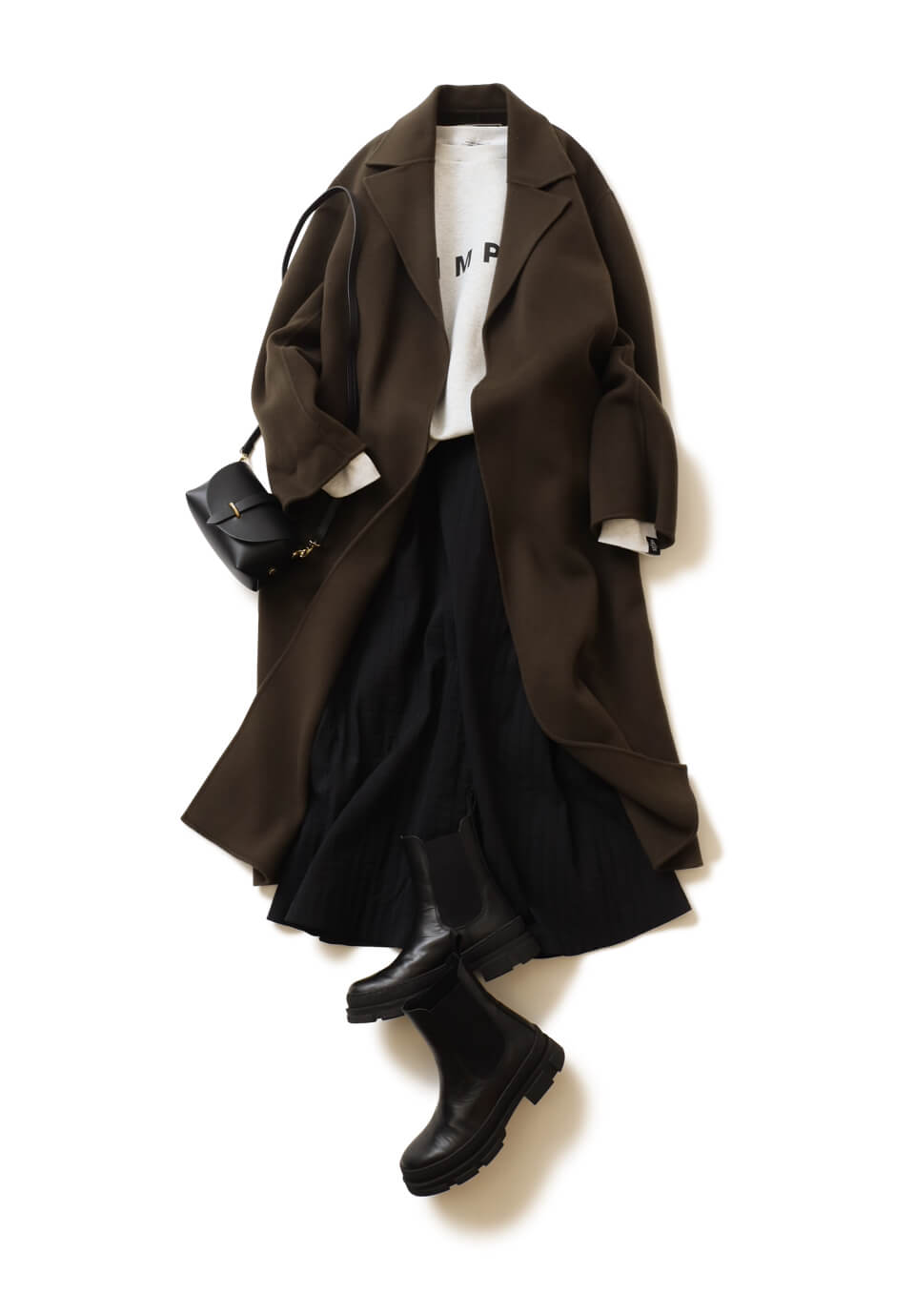 リラクシーなオーバーサイズのブラウンリバーコートに黒小物をトッピングして、落ち着いたトーンの大人カジュアルをメイク。インナーは、ライトグレーのミニマルなロゴスウェットで遊び心とクリーンなムードをプラス。つないだフレアスカートもトレンドのキルティング素材で表情豊かに。