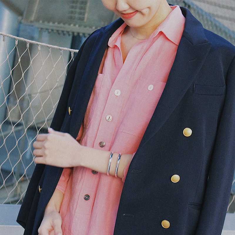 デニムのアイスブルー×ロングシャツのピンクのカラーの掛け合わせが一番のポイント。ウォッシュがかかったデニムはカジュアルに合わせるのではなく、綺麗めにクリーンな印象にスタイリングするのがマイルール!ジャケットやレザーのシューズを合わせればトラッド要素もプラス。