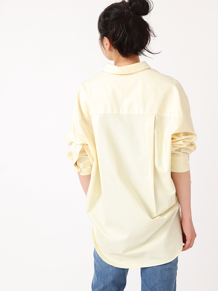 春らしい爽やかなイエローのオックスフォードシャツは、デニムと合わせてラフに着こなしたい。パールネックレスとミュールでコーディネートを格上げして。