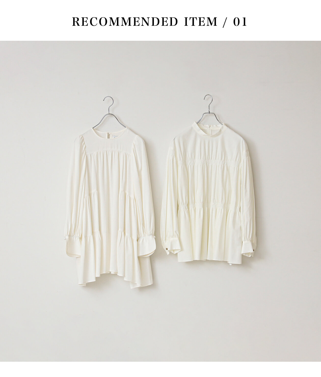 - 清潔感のあるホワイトのブラウス。サマータイプのホワイトはパキッとした色ではなく、ややくすみのある色味なので、さらに柔らかいニュアンスが出ます。ミニワンピ風に着られるティアードチュニックブラウスは、落ち感のあるとろみ素材も女っぽくて◎。