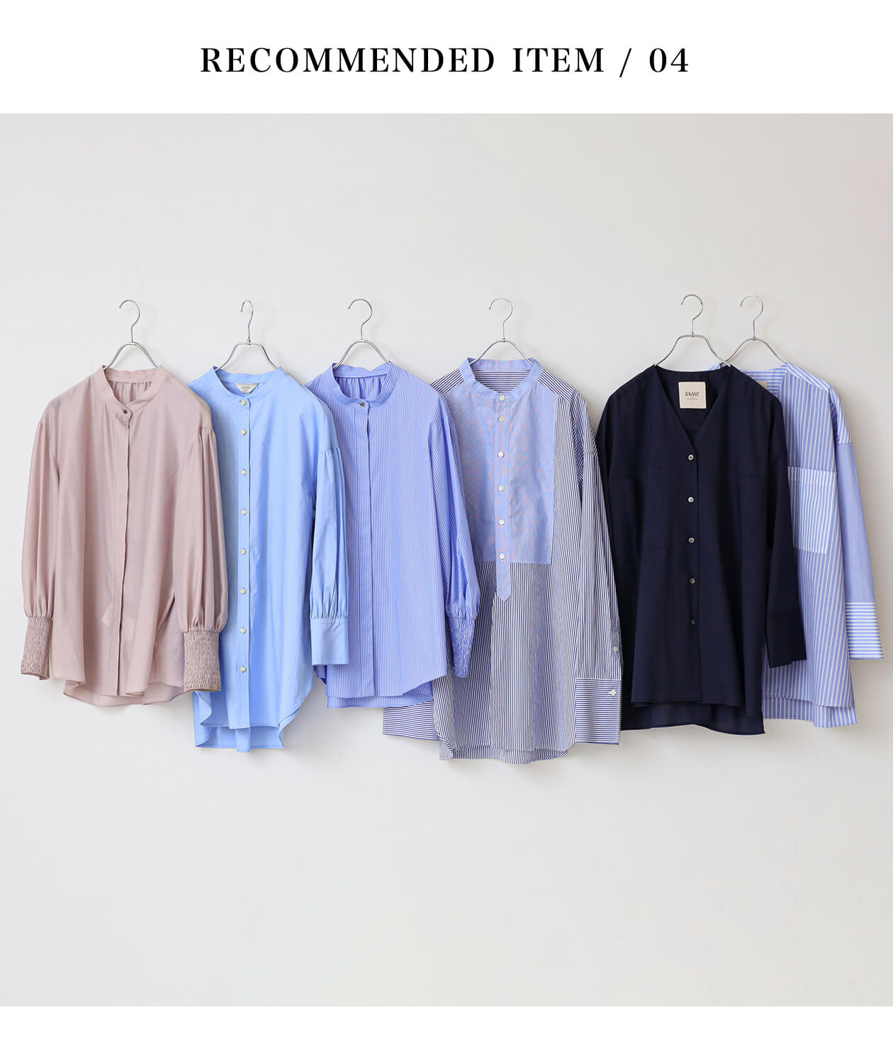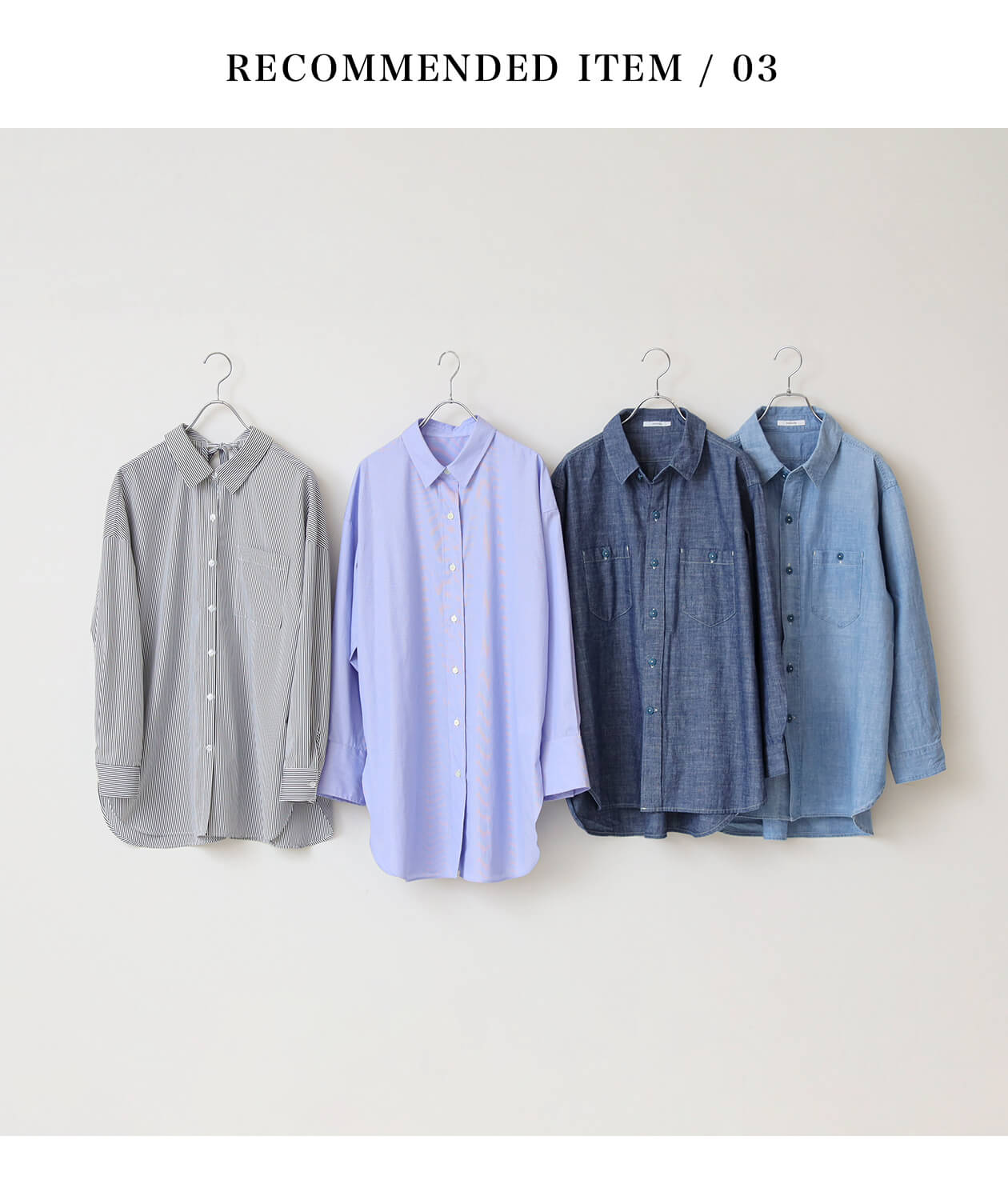 - サマータイプに多いブルーのシャツでも、ボーダーなど柄が加わるとまた違った印象に。ブルー×ネイビーなど、同系色の組み合わせもおすすめです。真面目な雰囲気にまとまらないように、こなれたオーバーサイズを選んで。ピンクを取り入れるなら上品なローズピンクが好印象。